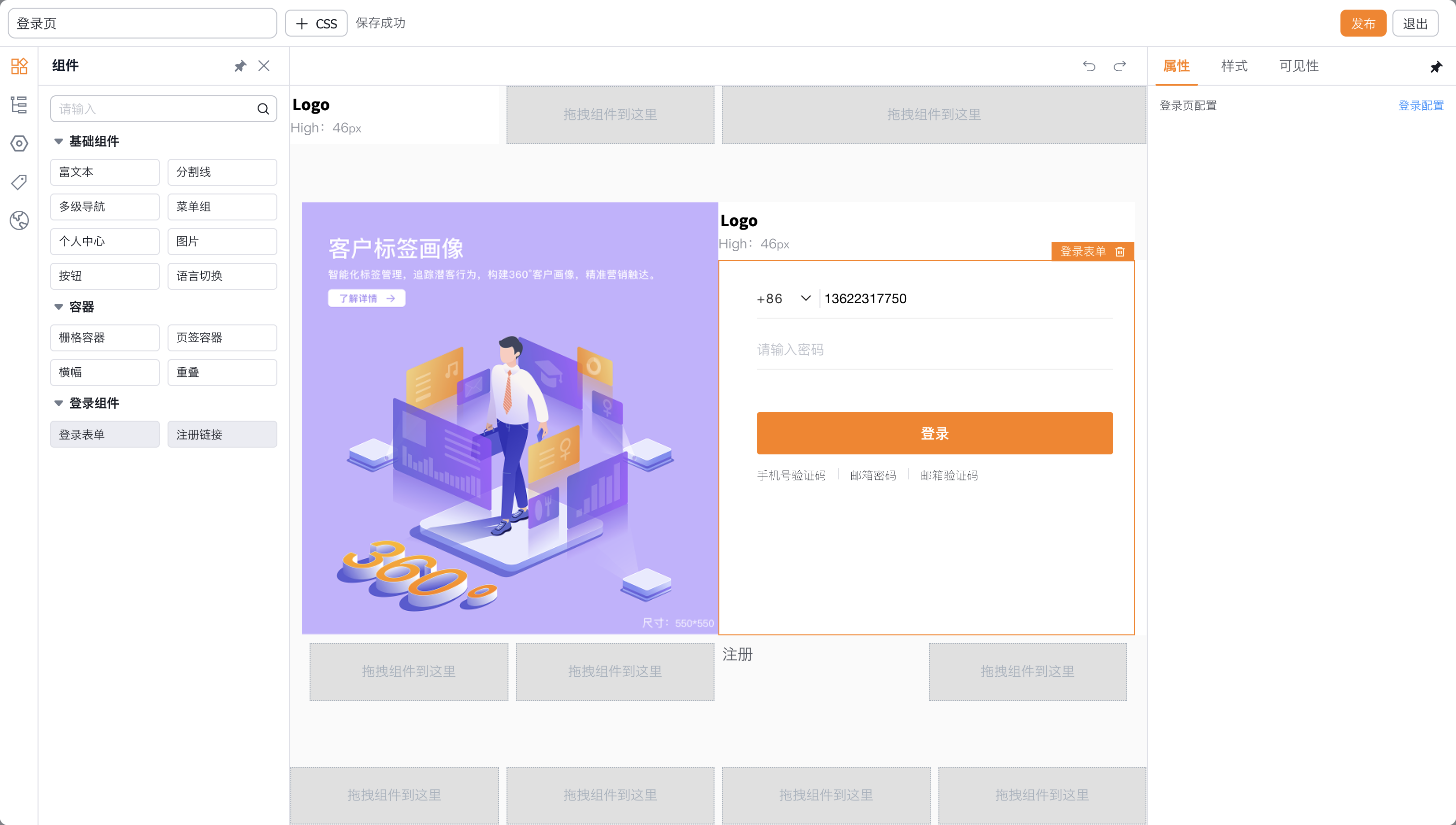 - 通过拖拽式设计器布局页面、添加业务组件