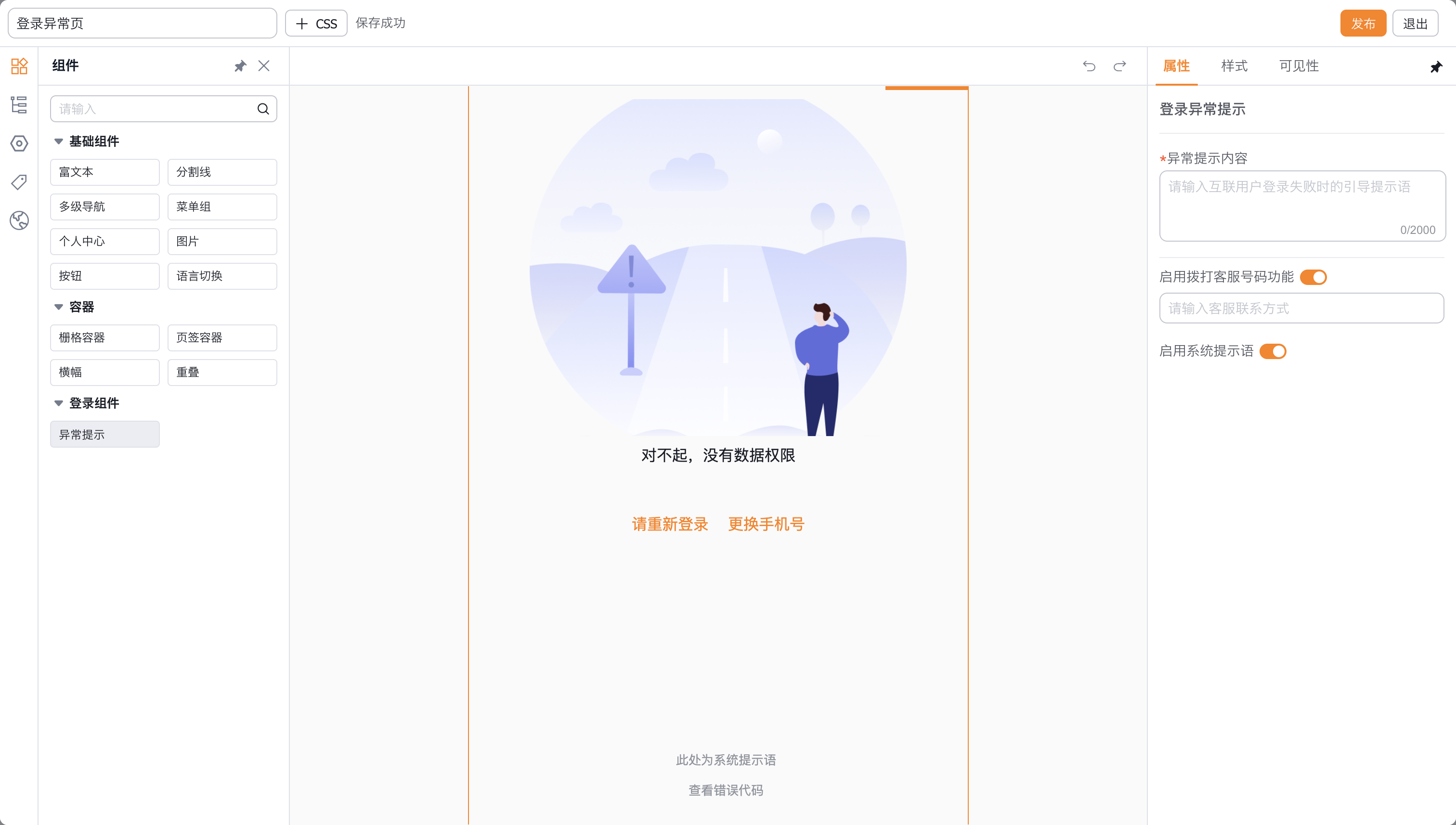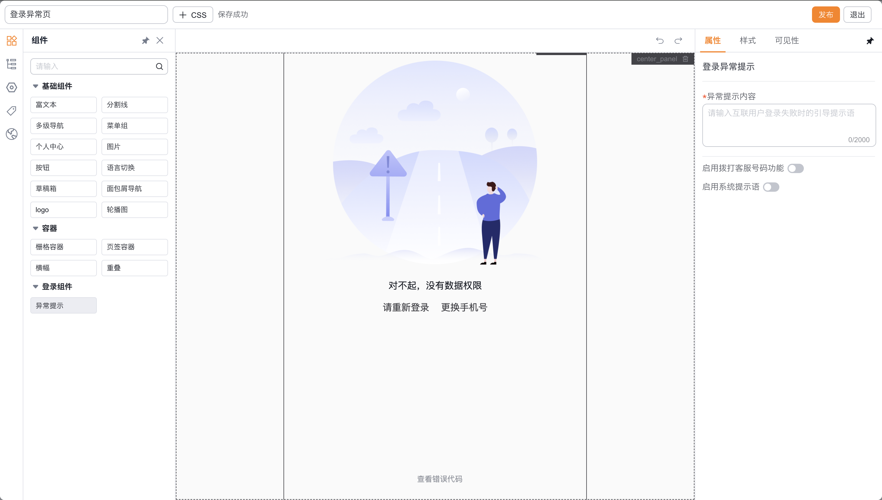 - 异常提示:用于在页面上向用户明确反馈错误或异常状态,说明原因并给出下一步处理建议,帮助用户纠正操作或联系支持。 异常提示还支持配置提示内容,启用客服电话,启用系统提示语