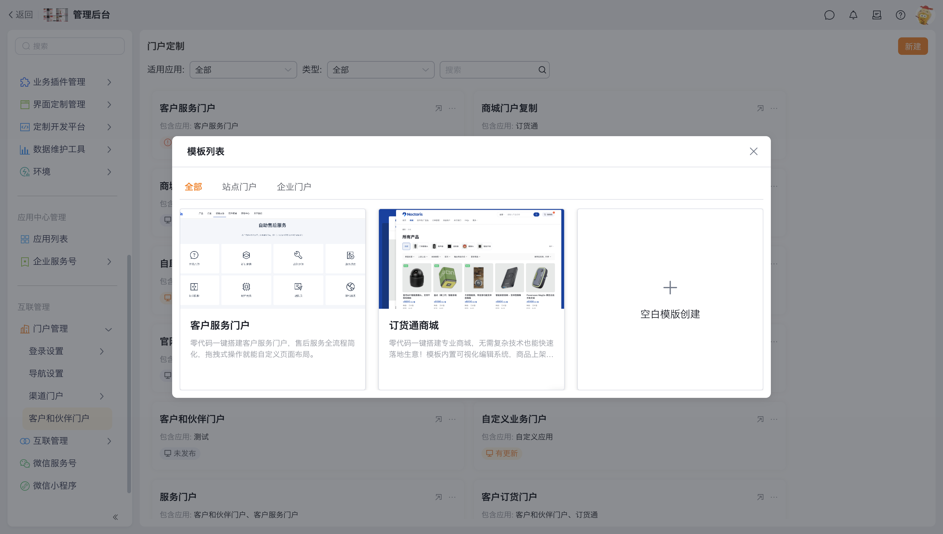 - 门户模板:预设互联应用根据客户的最佳体验提前预设的业务模板,方便管理员快速复用,简单微调就能做出好体验的专属业务门户。