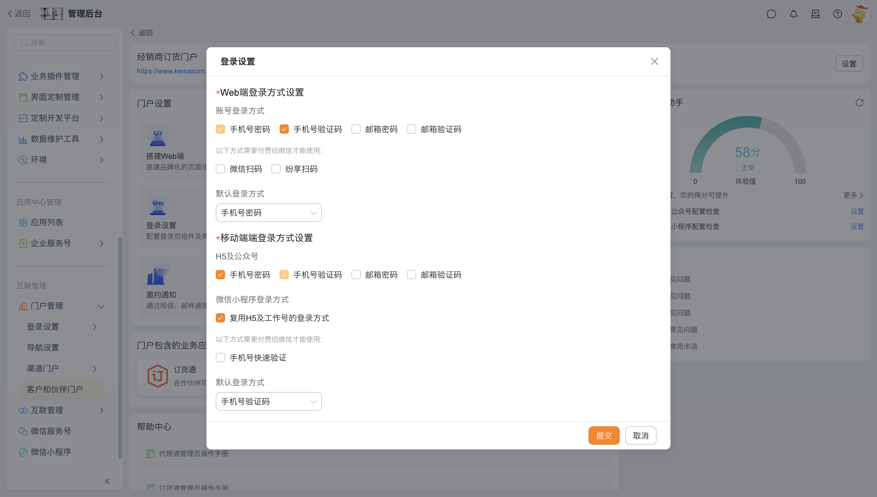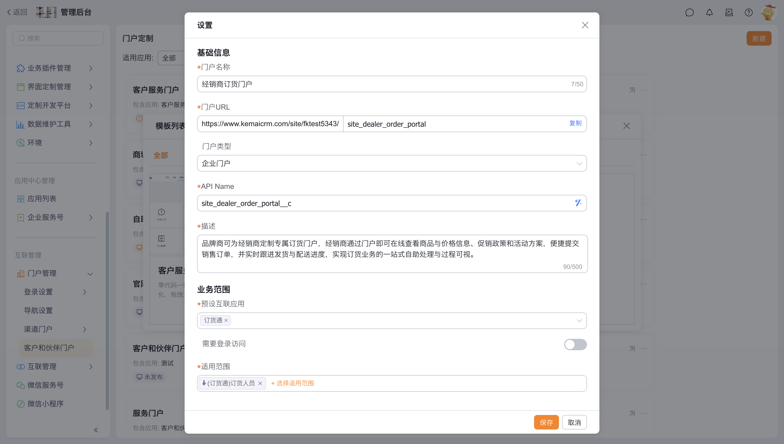 - 进入:【管理后台】 →【互联管理】 →【门户管理】 →【客户与伙伴门户】