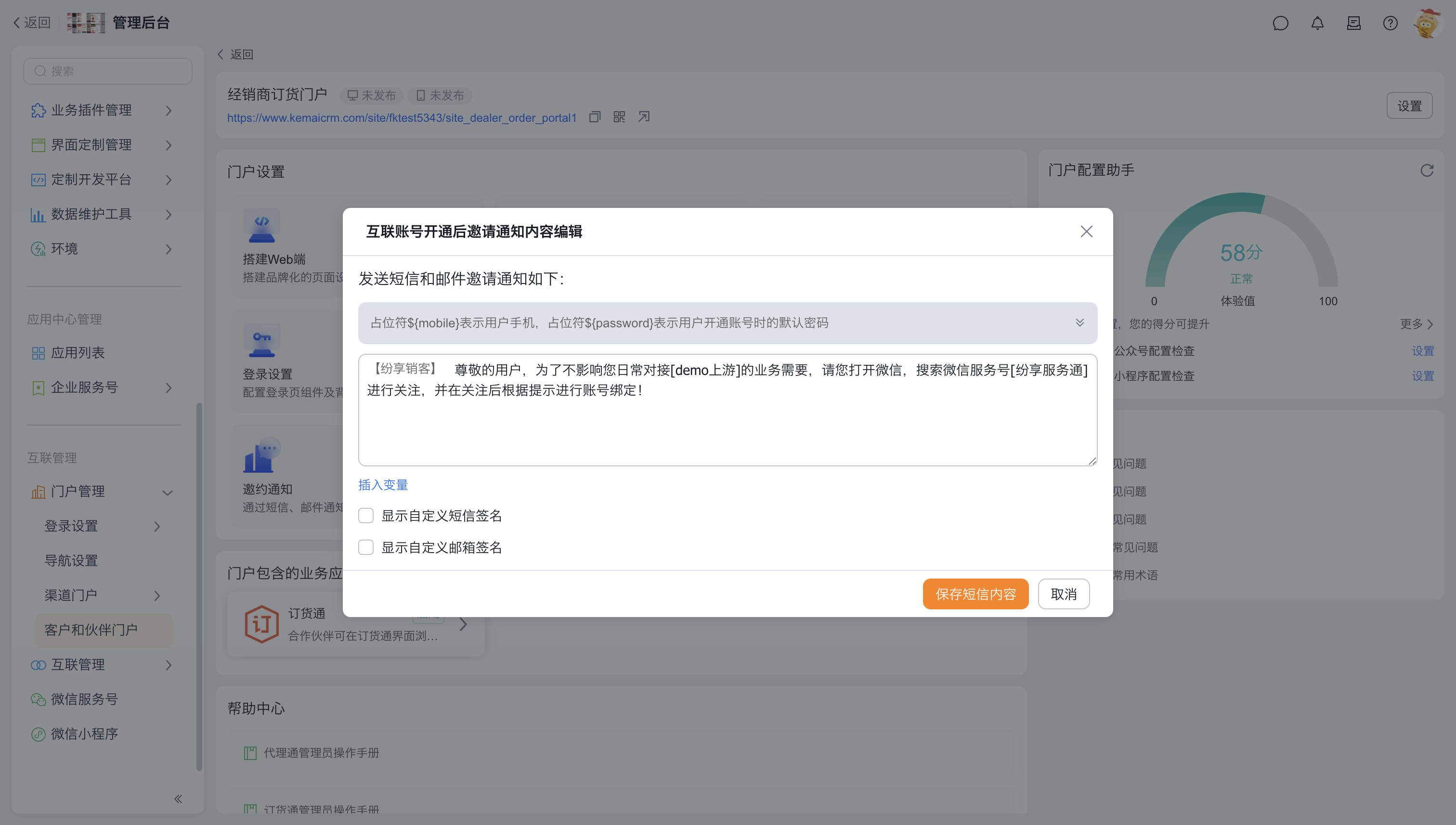 门户配置完成后,管理员很自然的初始化一些用户账号,此时系统会自动化的给初始化的账号进行短信或者邮件邀约。此项配置,支持定制邀请的内容和签名信息。