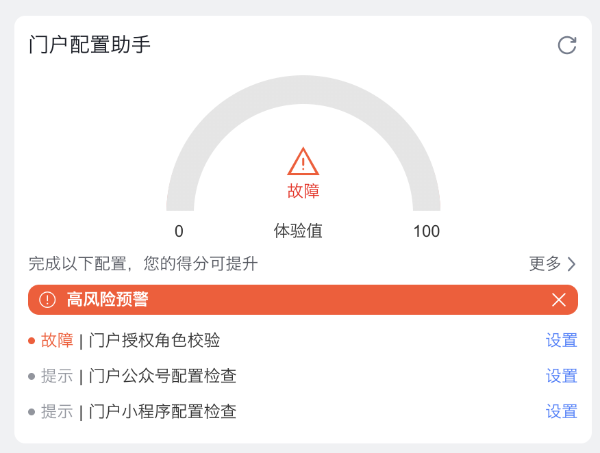 如上图:故障原因是门户授权角色校验异常,点击设置会前往【互联角色】-【权限设置】,完成设置后,重新回到门户详情页。有故障信息时,不会有得分信息。