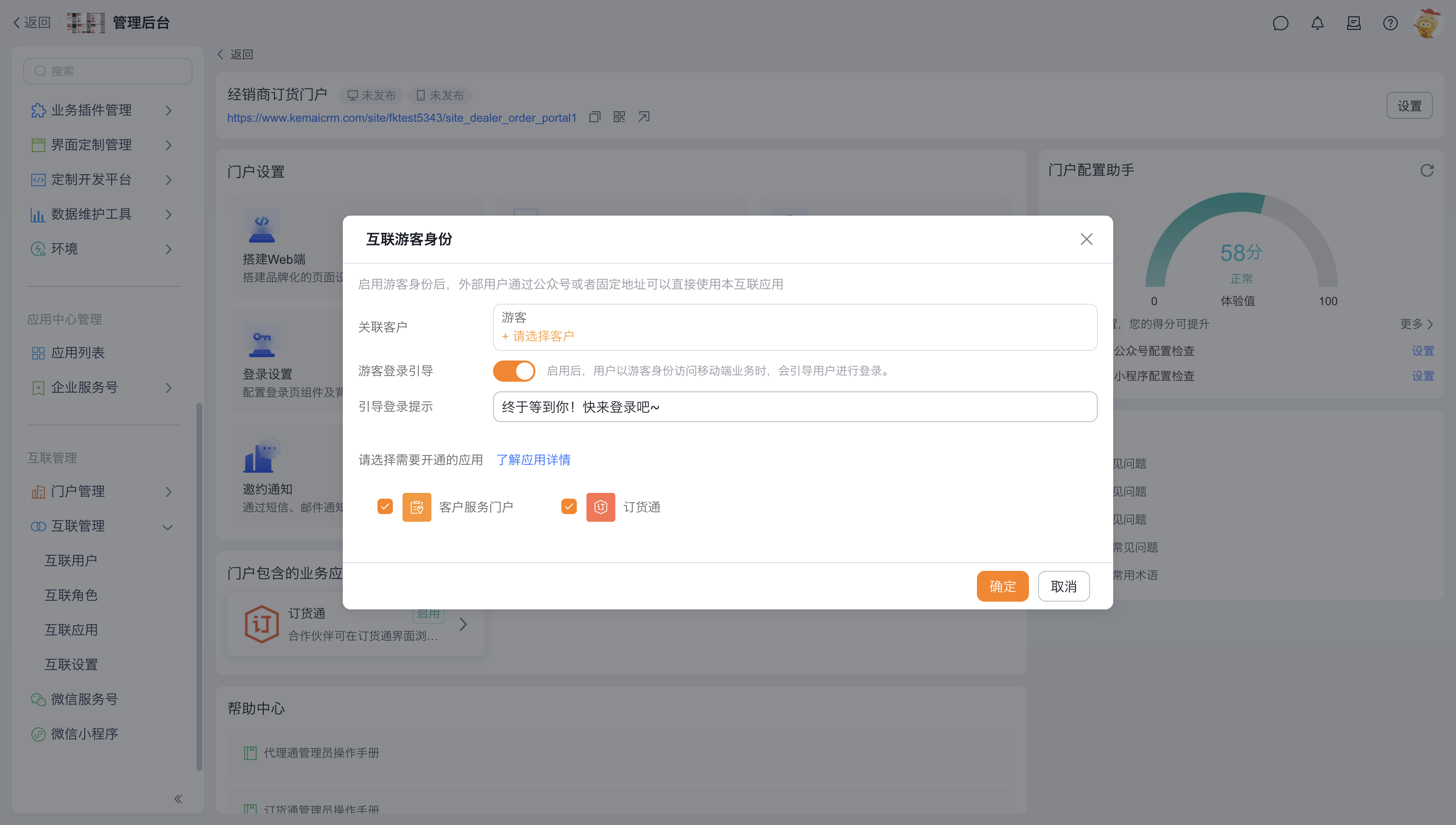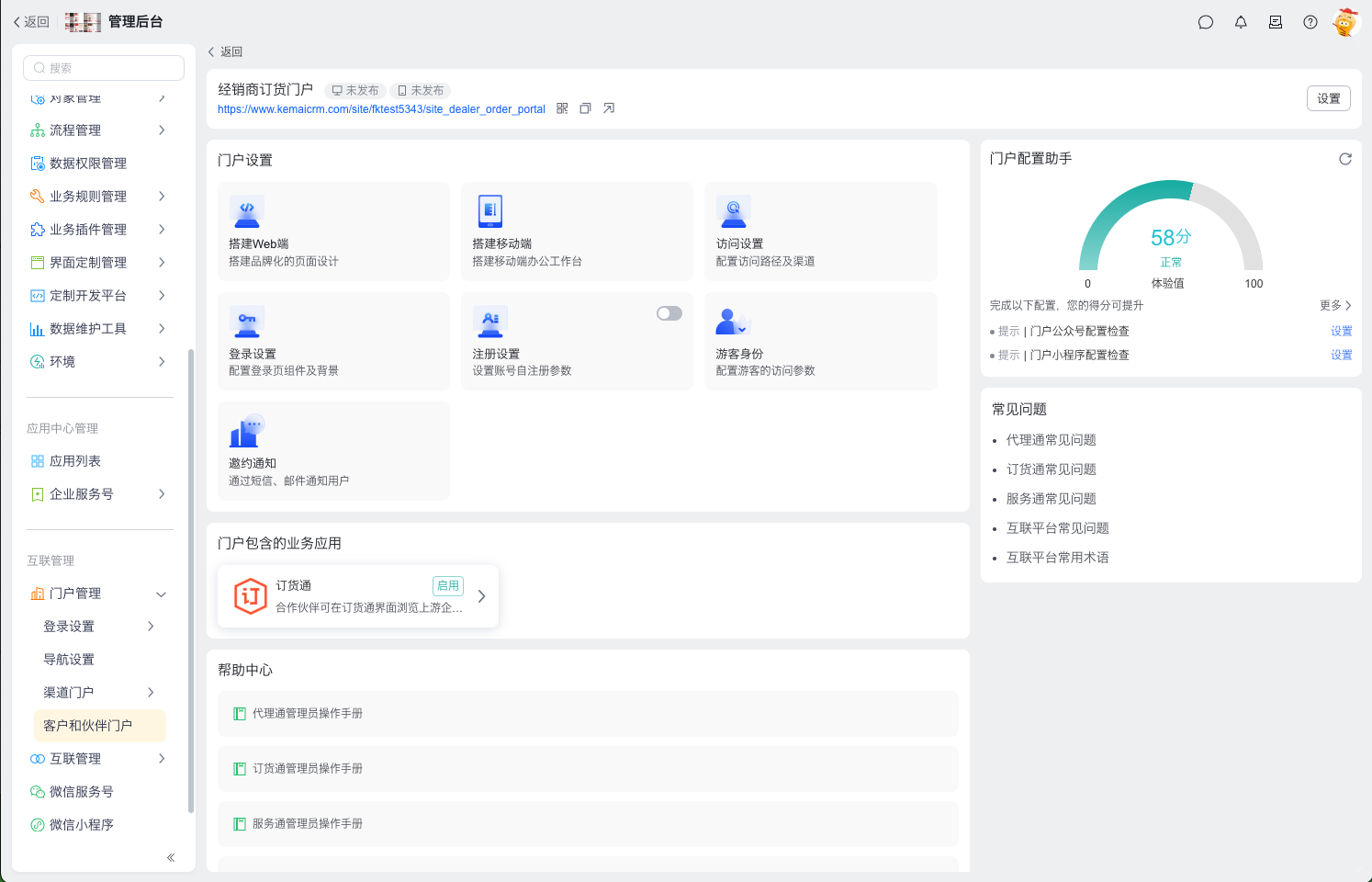 门户定制更多的是界面定制,用户注册,登录,访问定制,不涉及到业务定制。如果此时识别到门户中有些业务需要条件,通过互联应用快捷进入到应用管理模块下,完成应用的业务配置。例如:点击订货通后,会跳转到应用管理下》