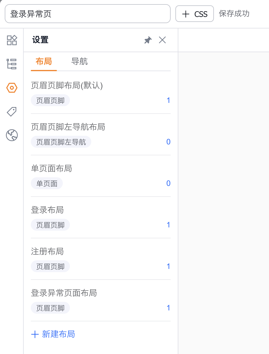 - 页面的布局样式:一般web端的布局样式包含【页眉页脚】、【页眉页脚左导航】、【单页面】,移动端后续会特有一个布局【底导航式】(当前建设中)。一套门户的所有页面中,页眉、页脚的组件一般会在同布局样式的页面中共用。