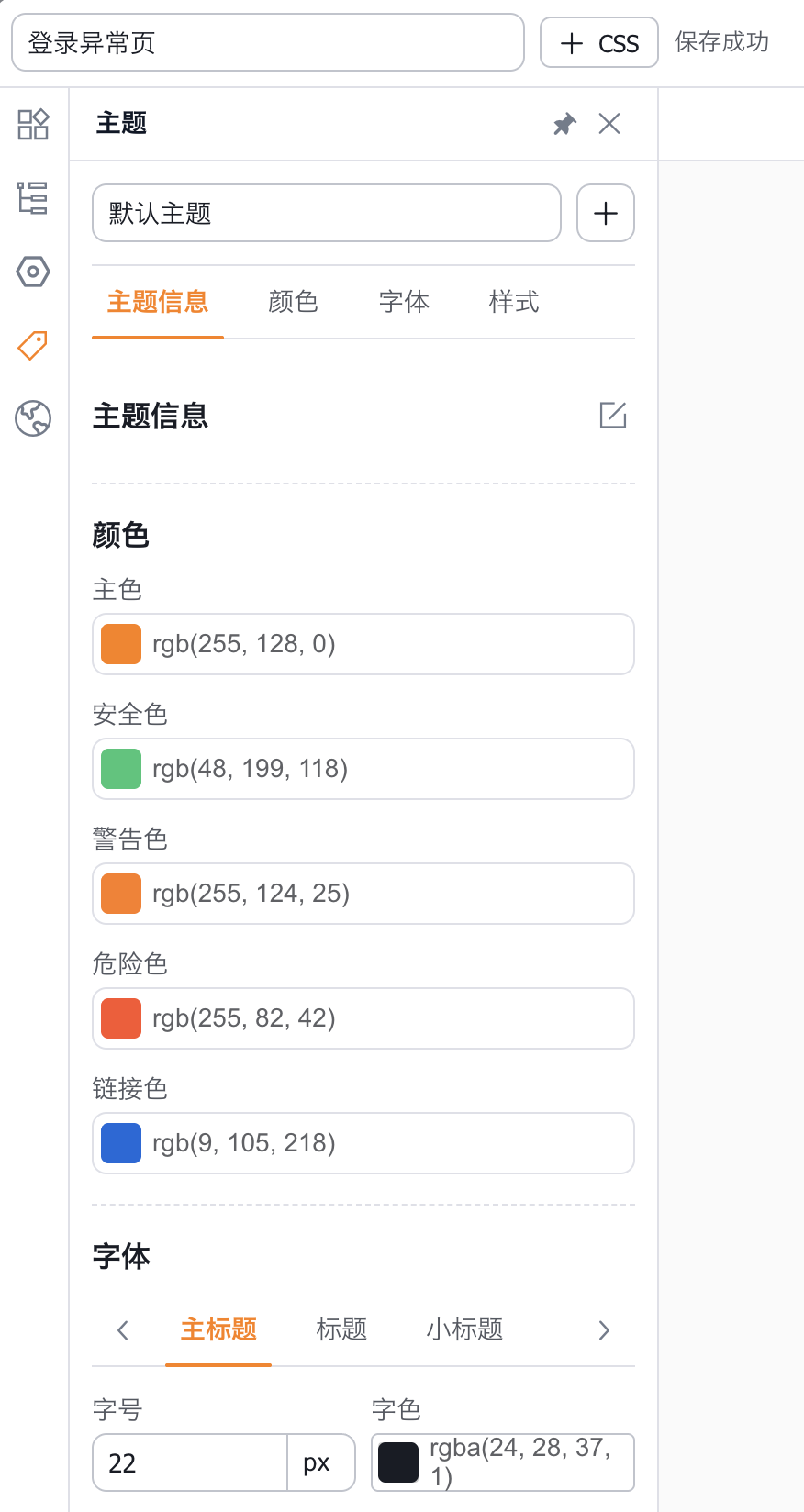 - 主题信息:支持配置主题信息的颜色配置,包含主色、安全色、警告色、危险色、链接色。支持设置字体,包含主标题、标题、小标题、正文、小正文、辅助文字的字体设置。支持样式设置,包含区域最大内容宽度、区域圆角、组件间距、区域内边距