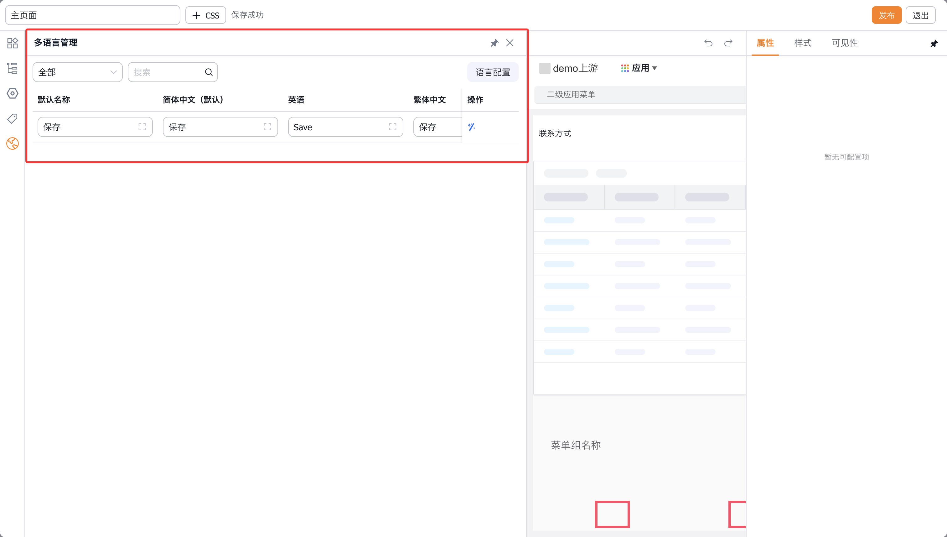- 多语言管理:支持配置主题信息的颜色配置,包含主色、安全色、警告色、危险色、链接色。支持设置字体,包含主标题、标题、小标题、正文、小正文、辅助文字的字体设置。支持样式设置,包含区域最大内容宽度、区域圆角、组件间距、区域内边距