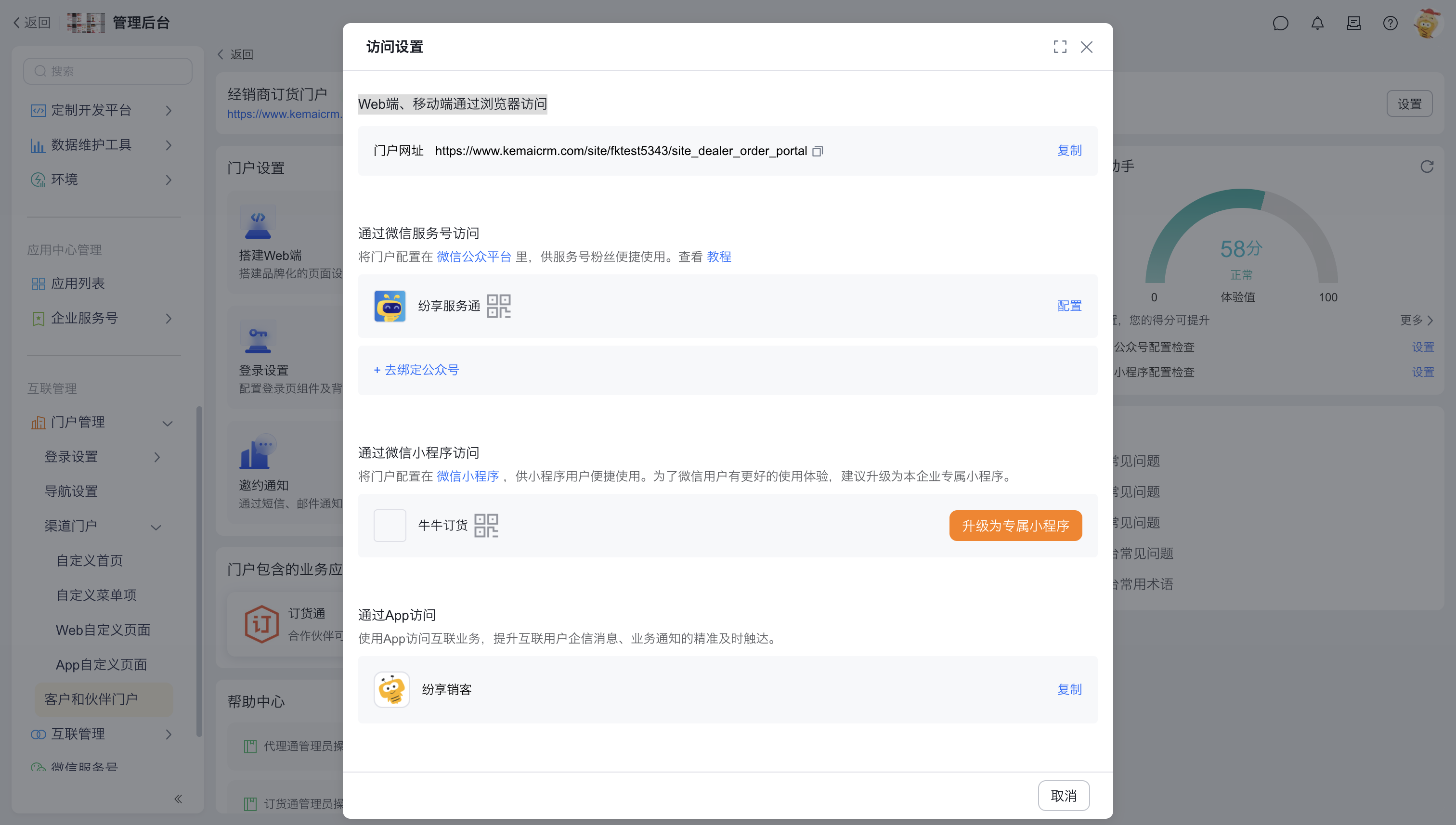 - 通过微信小程序访问:如果当前租户有托管的小程序,则会显示小程序,且后续版本中支持小程序直接绑定关联门户。如果当前租户没有小程序,则弹窗中都不会显示小程序入口。