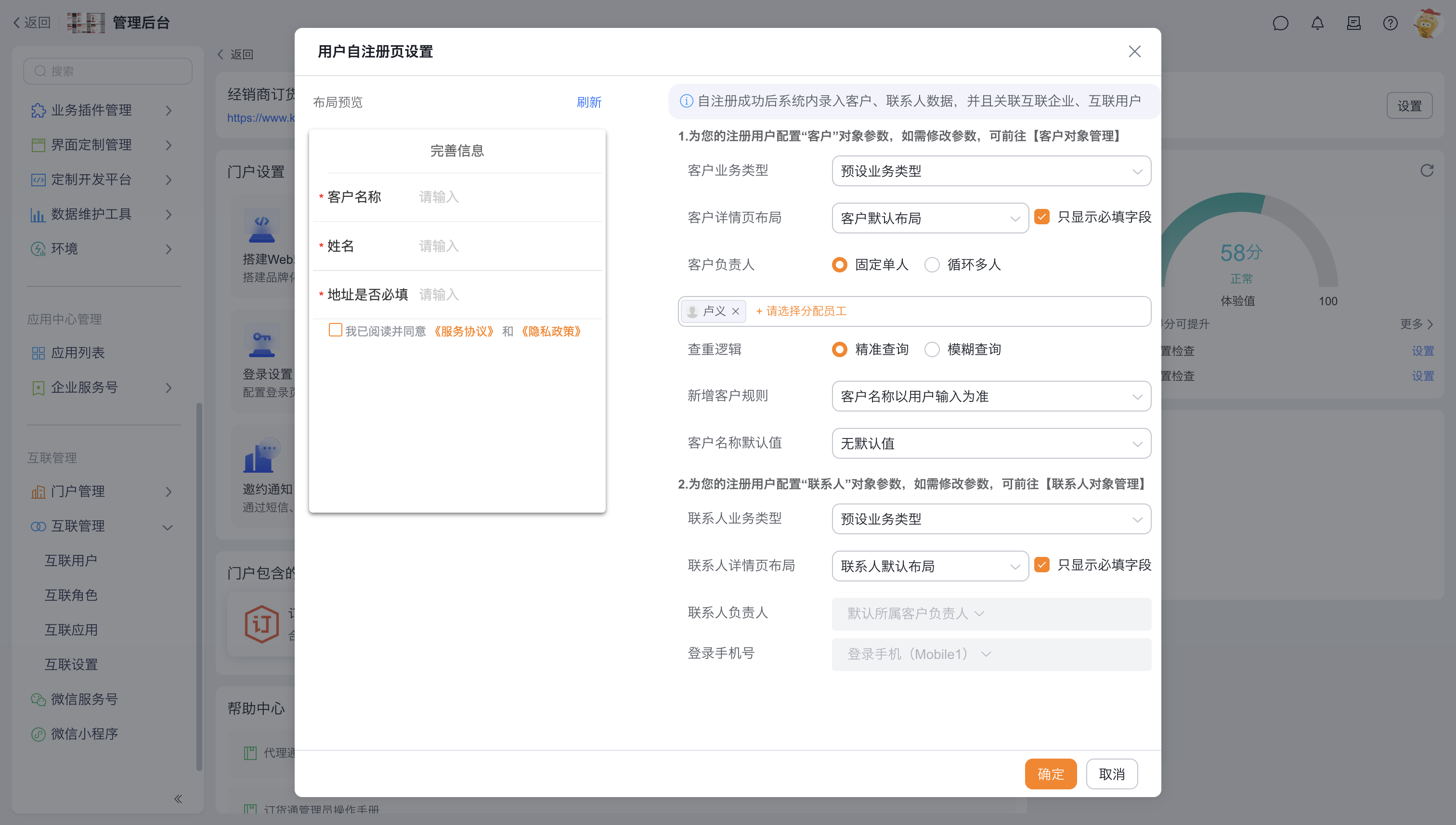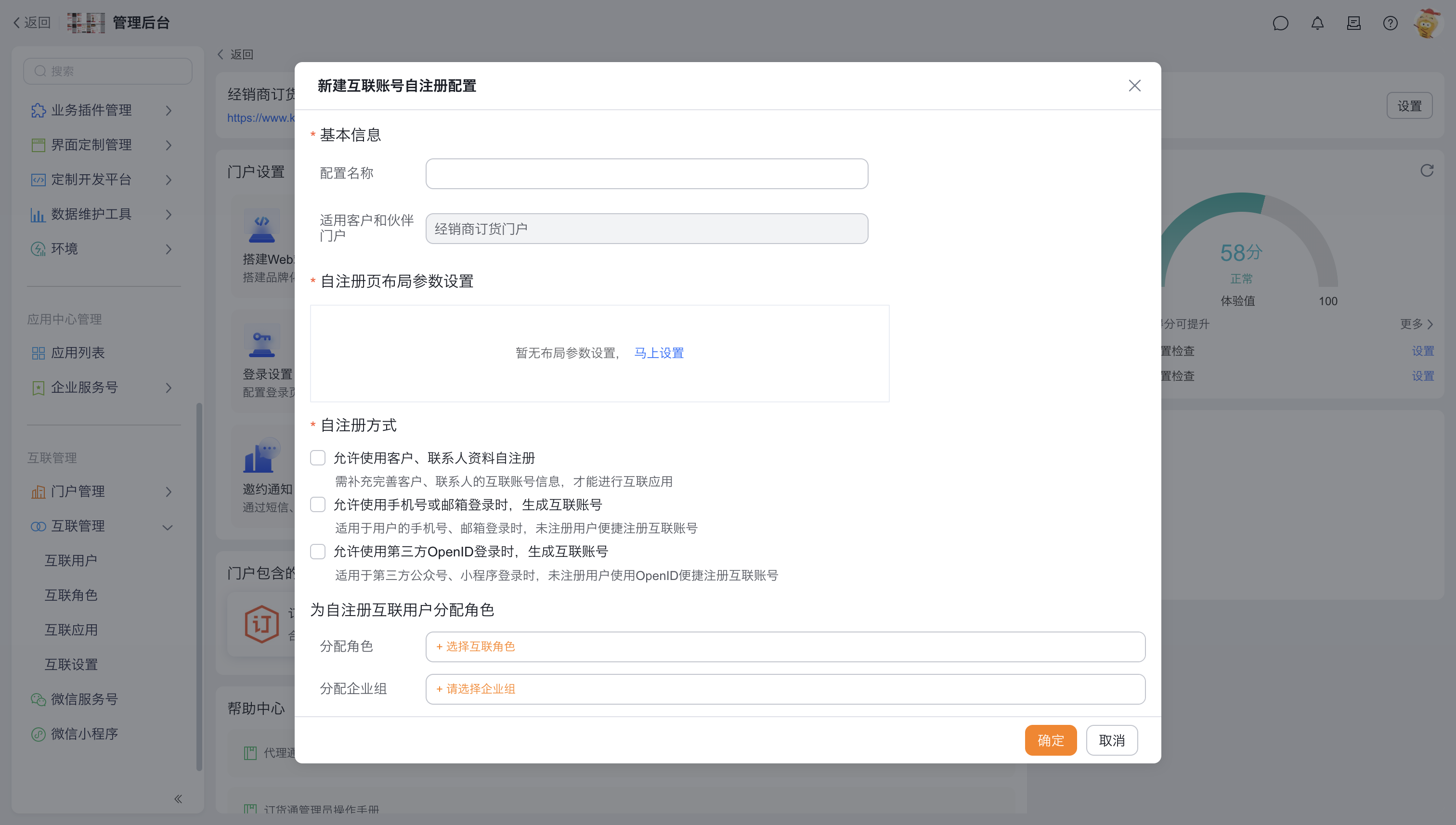 一般情况下,不用开启注册能力,品牌的订货业务,价格策略其实都是针对经销商特有的,少量场景下游,也允许通过营销活动吸引来的客户进行订货时,可以开放自注册能力。根据弹窗完成注册信息配置
