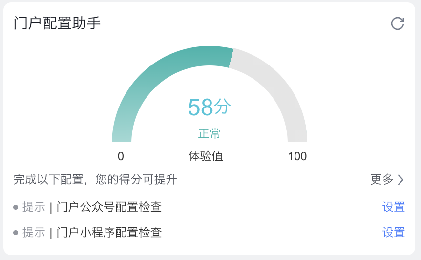 如上图:提示信息是公众号和小程序没有配置完成,点击设置后,会弹窗显示【访问设置】,完善服务号访问后,提示信息会移除,会有新的得分。