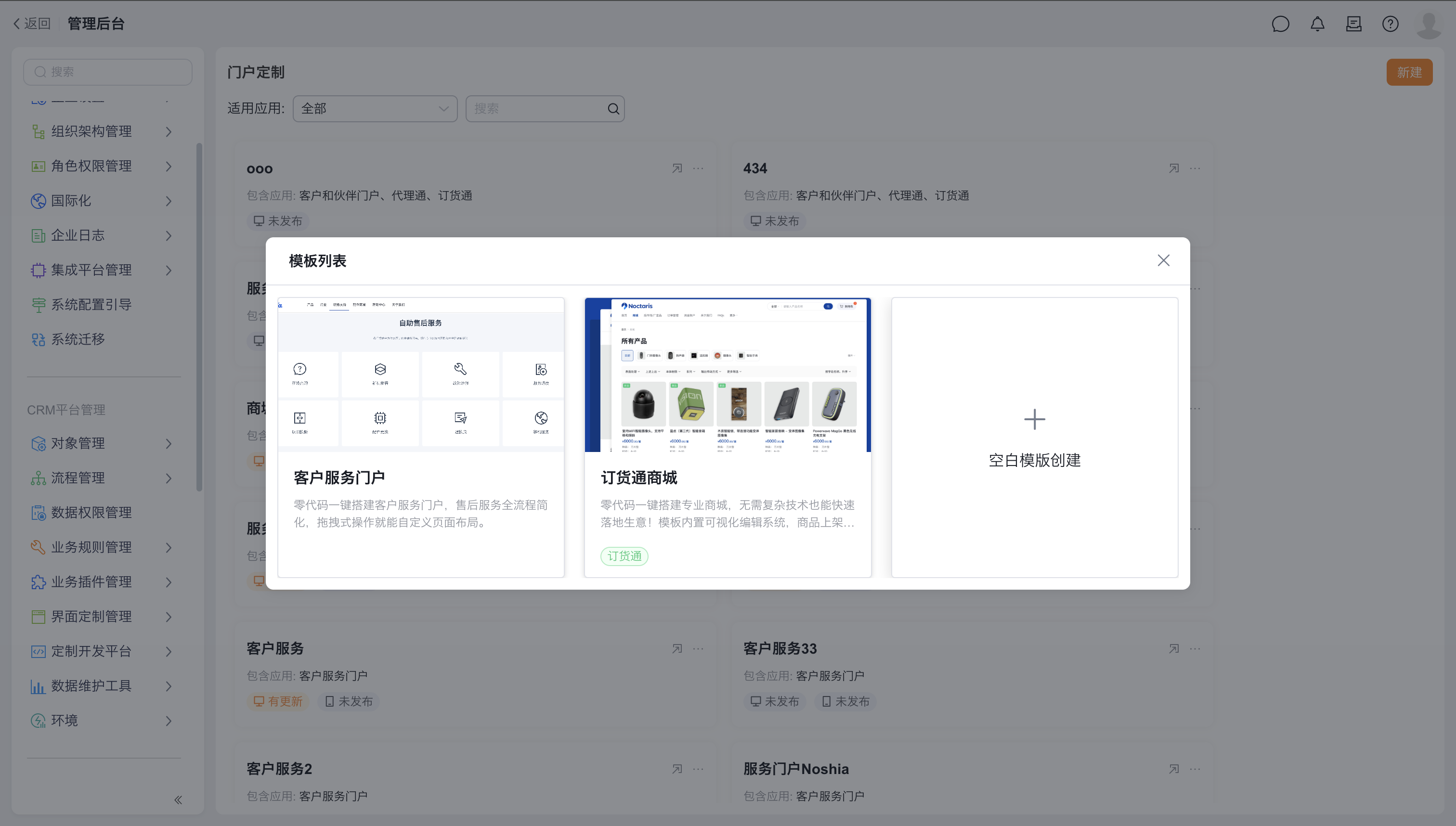 站点门户当前预设了两个模板,包含:【客户服务门户】和【订货通商城】