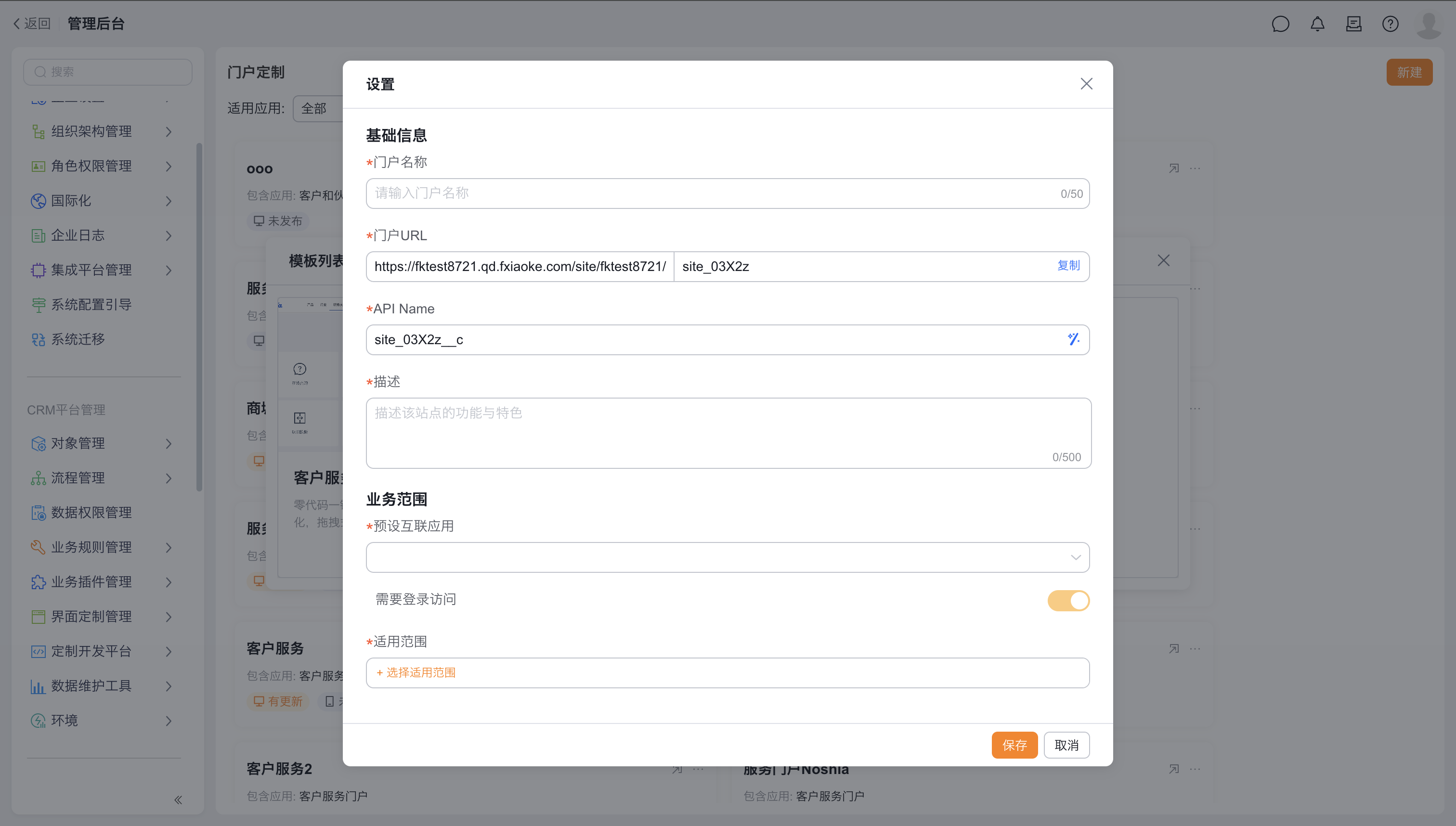 - 适用范围:门户支持哪些互联角色进行使用,如果当前用户的互联角色不在门户的使用范围内,当前用户进入门户时,会提示没有权限访问。适用范围是进一步保障门户数据的安全性机制。