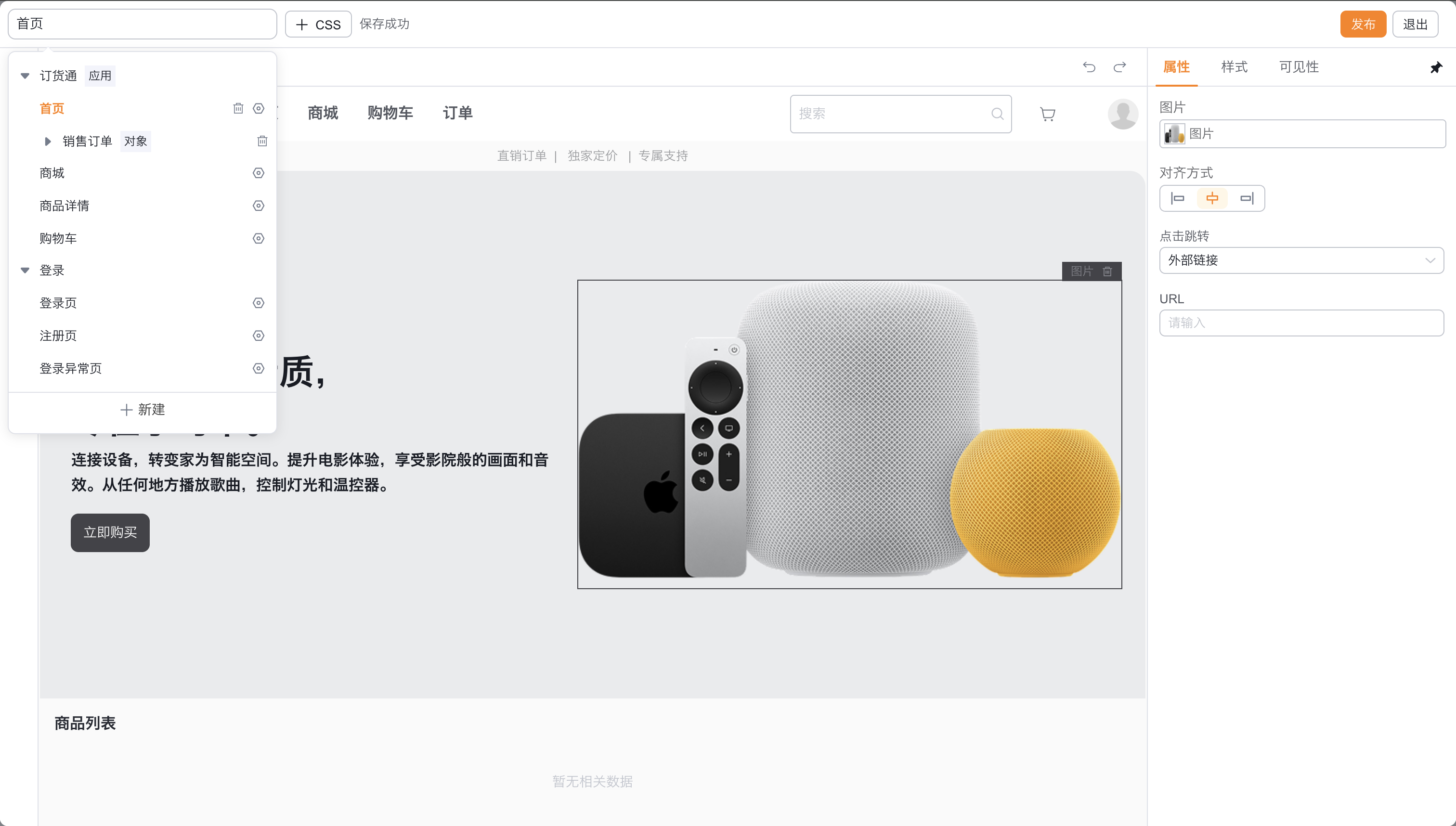 全部页面会按预设类型分组: 包含应用预设页面,例如:首页、商城、购物车 包含通用预设页面,例如:登录页、注册页、登录异常页 自定义页面,例如:销售订单(销售订单列表页、销售订单详情页、销售订单新建页)
