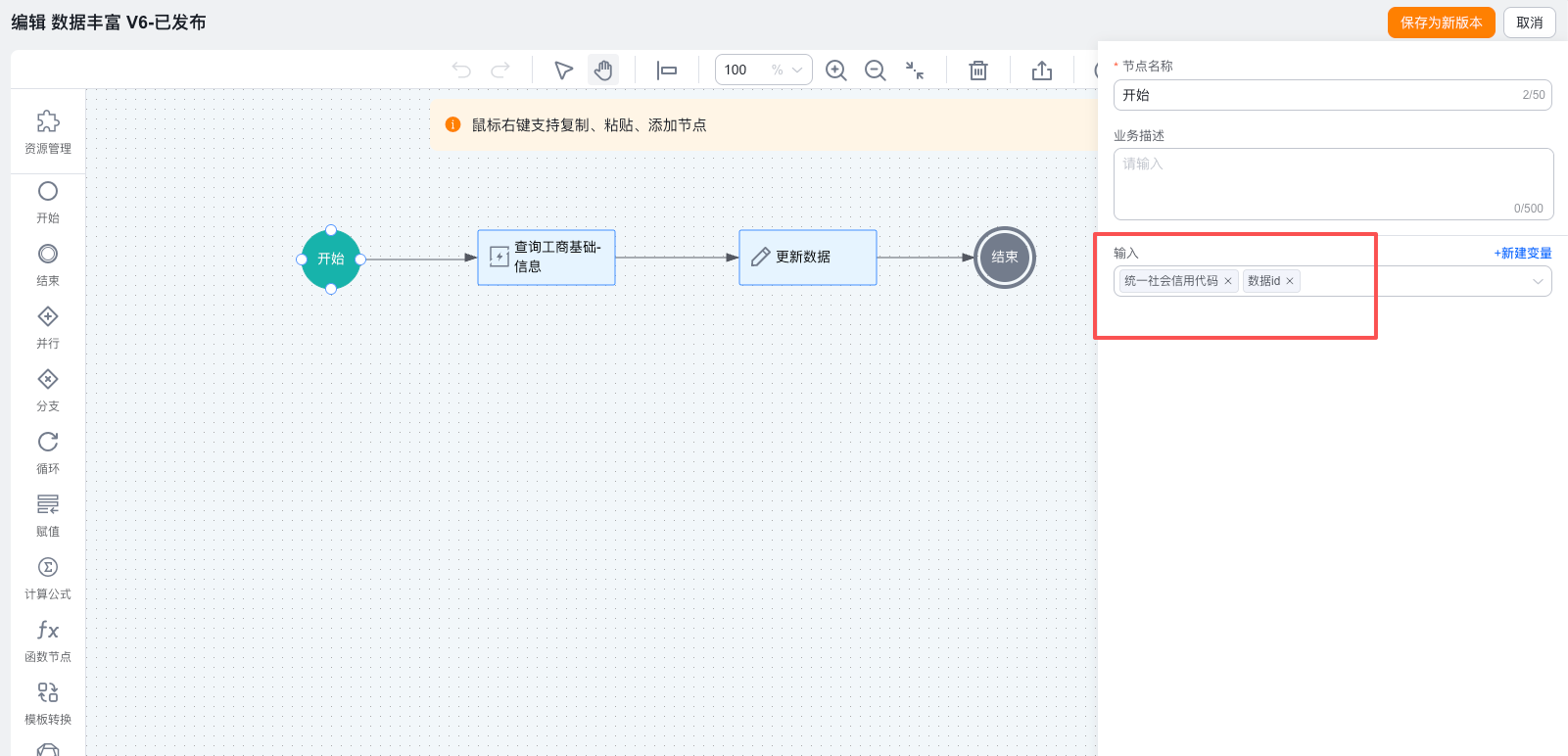 1️⃣ 在开始节点中,输入节点中创建并选择【统一社会信用代码】【数据id】变量,注:查询企业信息时入参建议都使用社会统一信用代码去查,因为企业名称会发生变更,但是社会统一信用代码不会。此处数据id的入参是为了在更新数据节点的时候,更新当前数据id的数据,如果不选择可能会更新执行对象的全部数据。