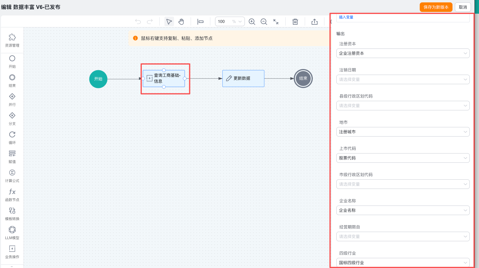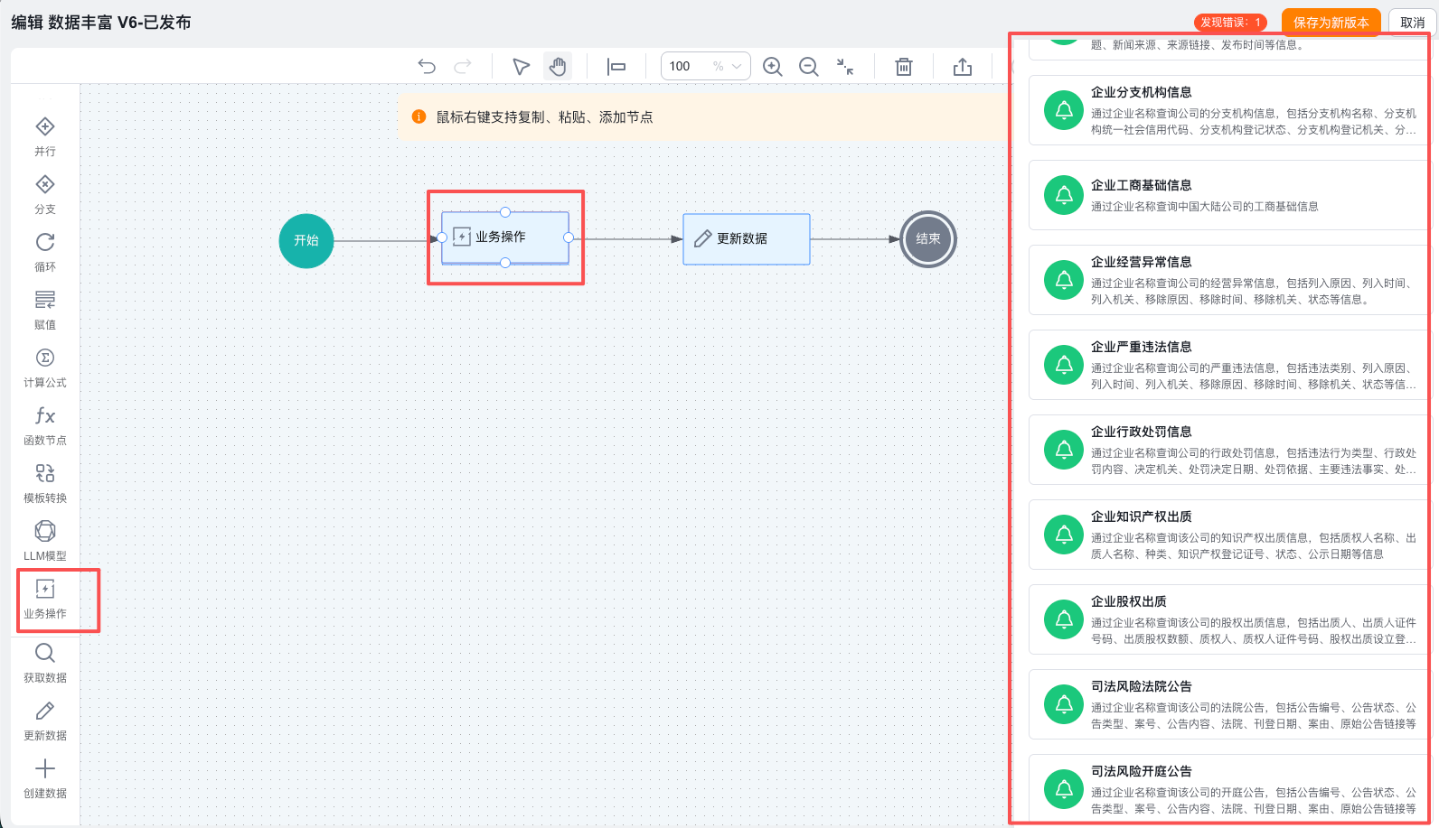 2️⃣ 在流管理中新建流,添加【业务操作】节点,并在业务操作节点中选择【企业工商基础信息】,将操作输出到相关变量中。备注:所有的情报助理Agent预设的操作,均可以在流管理的业务操作中进行选择获取。