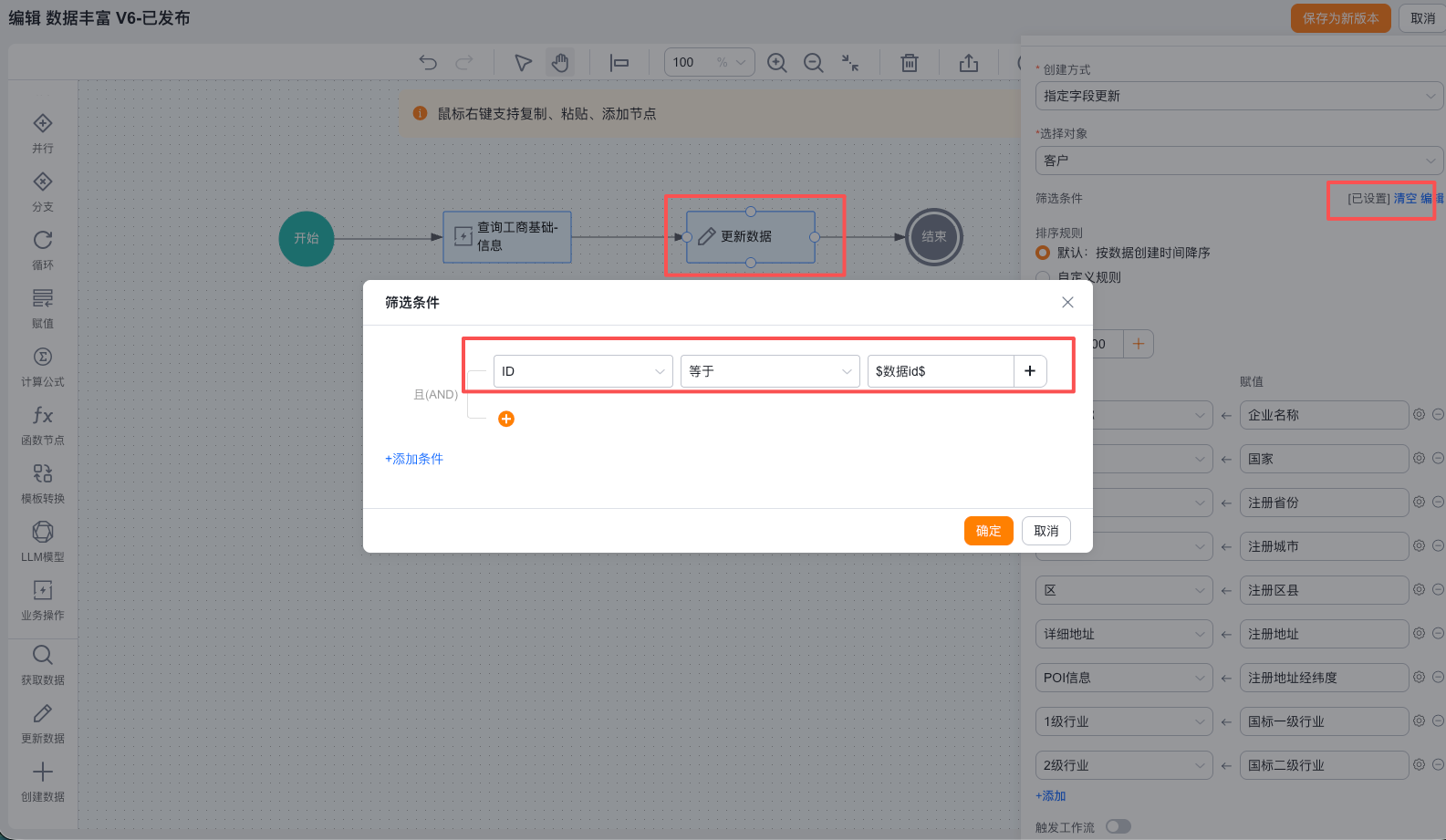 3️⃣添加【更新数据】节点,在筛选条件中选择id等于数据id,这样当通过工作流触发流的时候,对应触发的数据id作为变量传到流中,更新当前的数据,如果不选可能会执行更新对应对象的全部数据