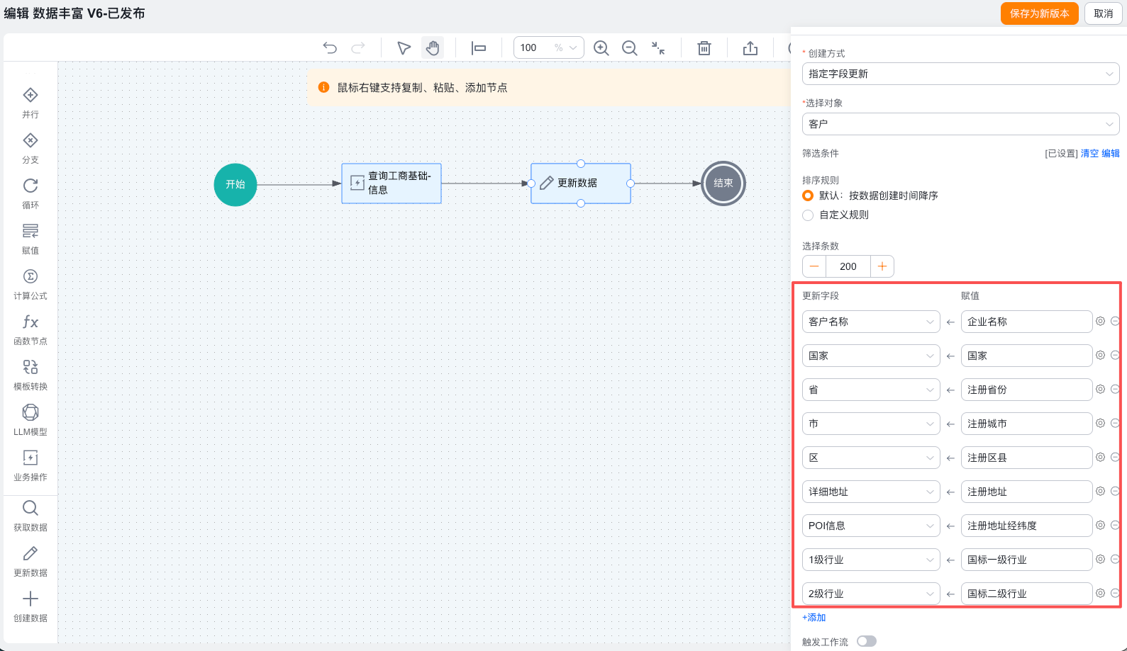 通过情报助理Agent中的工商数据,使用流能力,在流编排中获取数据后去丰富CRM的业务数据信息。