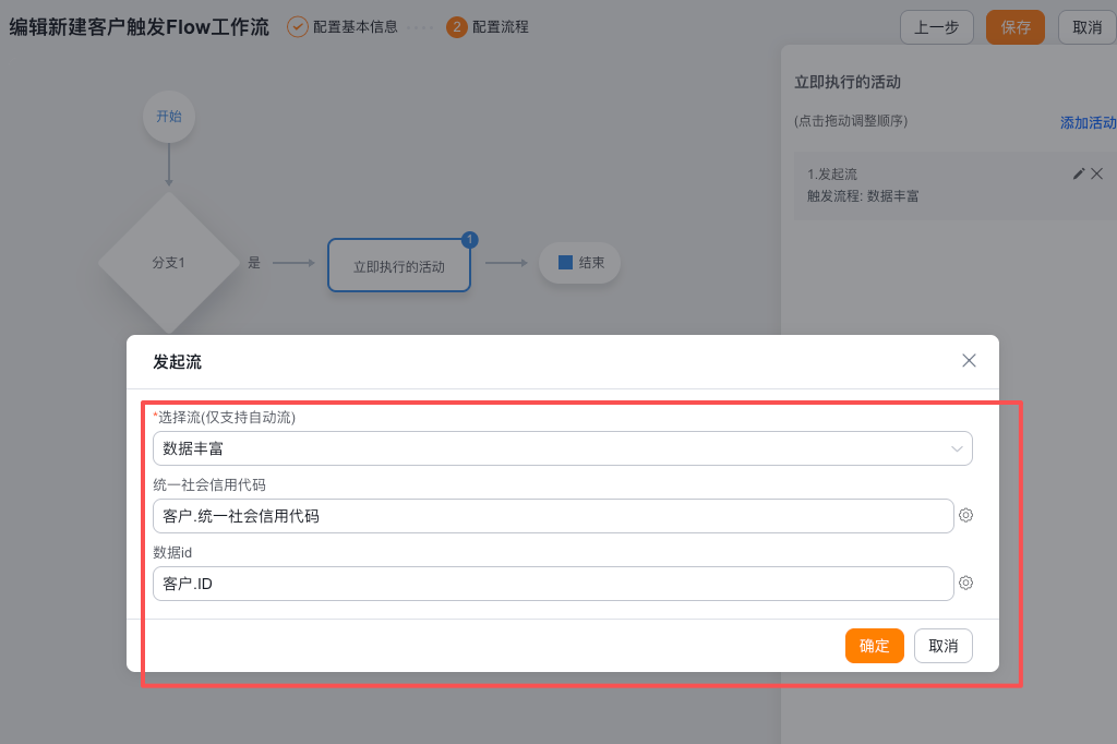 5️⃣ 客户对象触发工作流,后动作执行【发起流】,选择刚才创建的流管理,并将刚才开始节点中的变量进行选择传入。举例:将客户对象上的【社会统一信用代码】字段传值到流的统一社会信用代码变量上,当前的数据id传到数据id变量上。