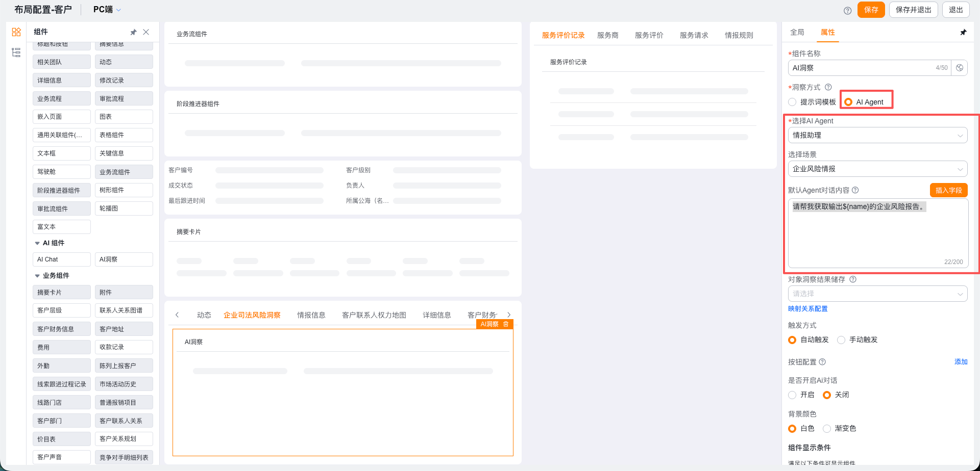 在对象详情页布局配置上,配置【AI洞察】组件,组件中可选择【情报助理】Agent中的场景,进行预设提示词,配置需要获取的情报内容。