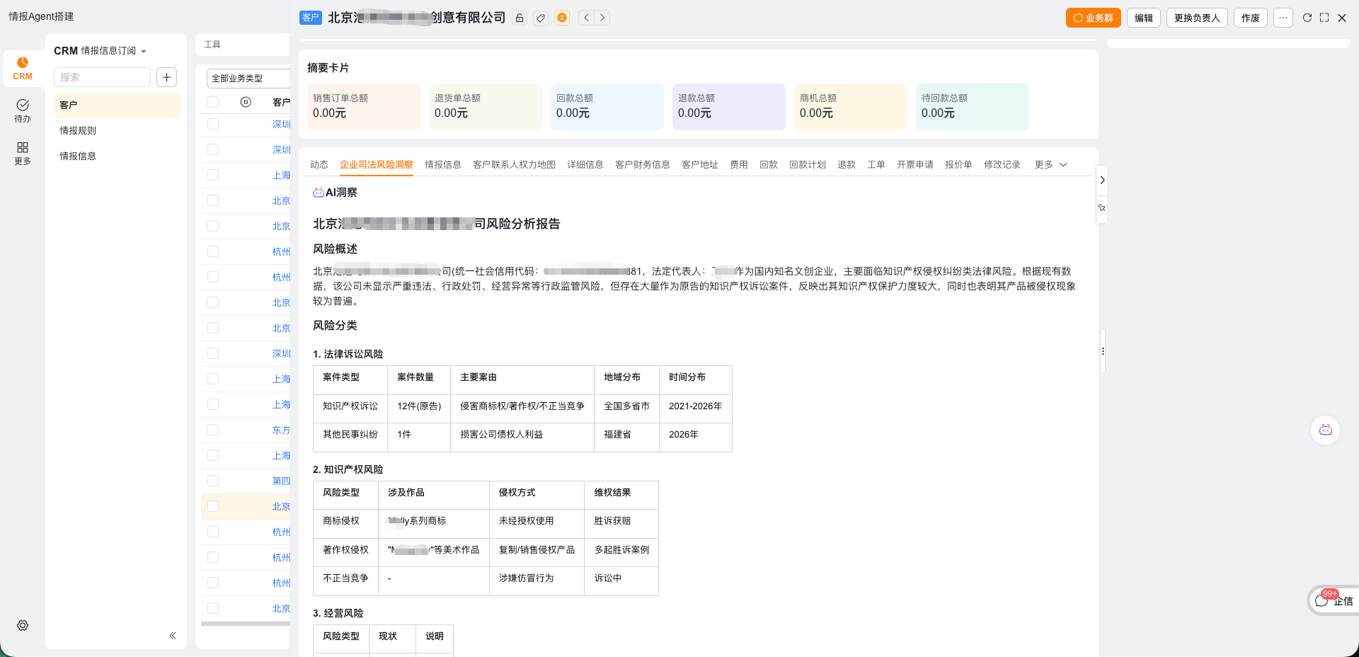 场景举例:在客户对象上展示当前企业风险报告信息,洞察企业风险。
