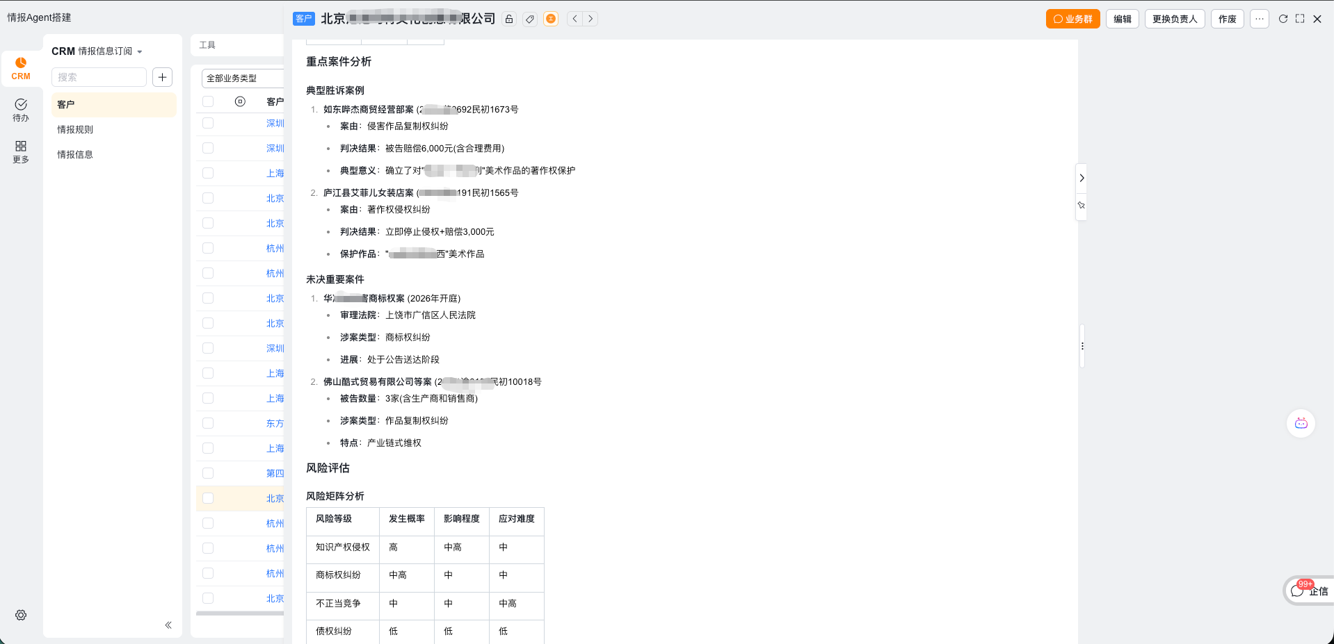 举例:在客户详情页配置后,以客户名称作为变量,查询企业的风险信息。配置完成后,进入详情页会直接获取对应企业的风险内容。
