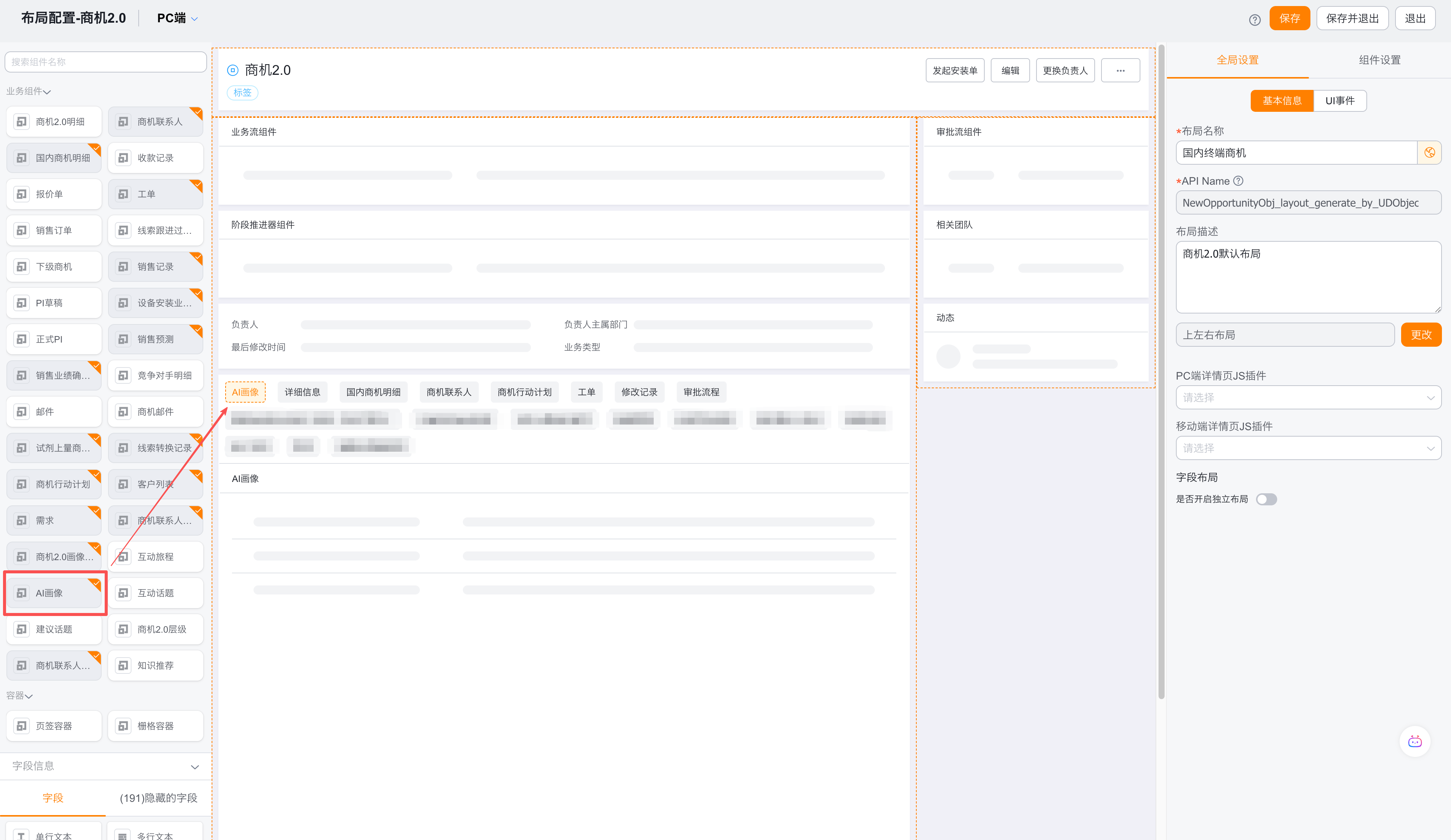 配置方法:进入要展示画像的详情页布局编辑页,将左侧业务组件中的“AI画像”组件拖入到展示区。