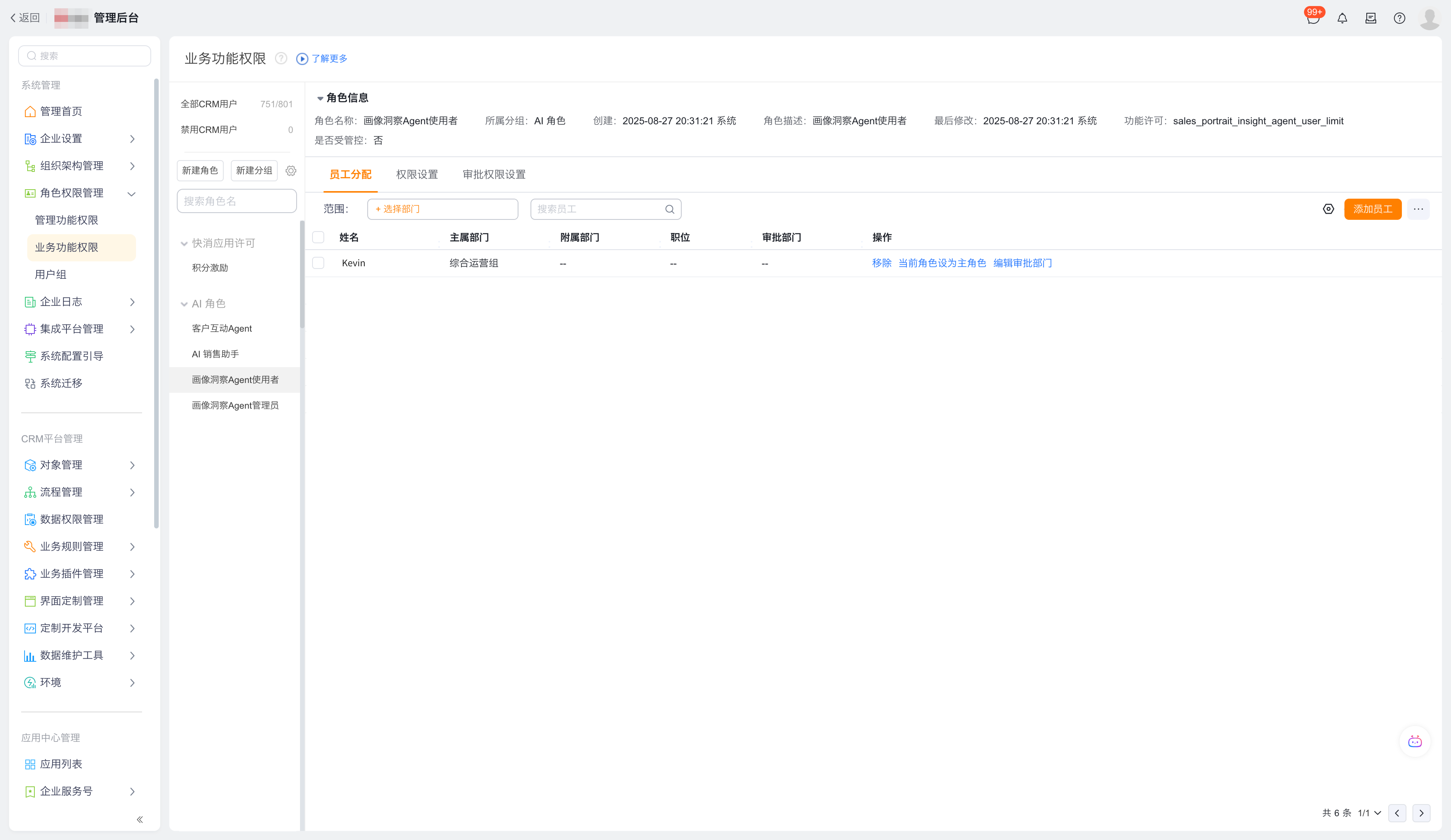 配置方法:找到AI角色分组中的“画像洞察Agent使用者”、“画像洞察Agent管理者”角色,添加人员进行授权。