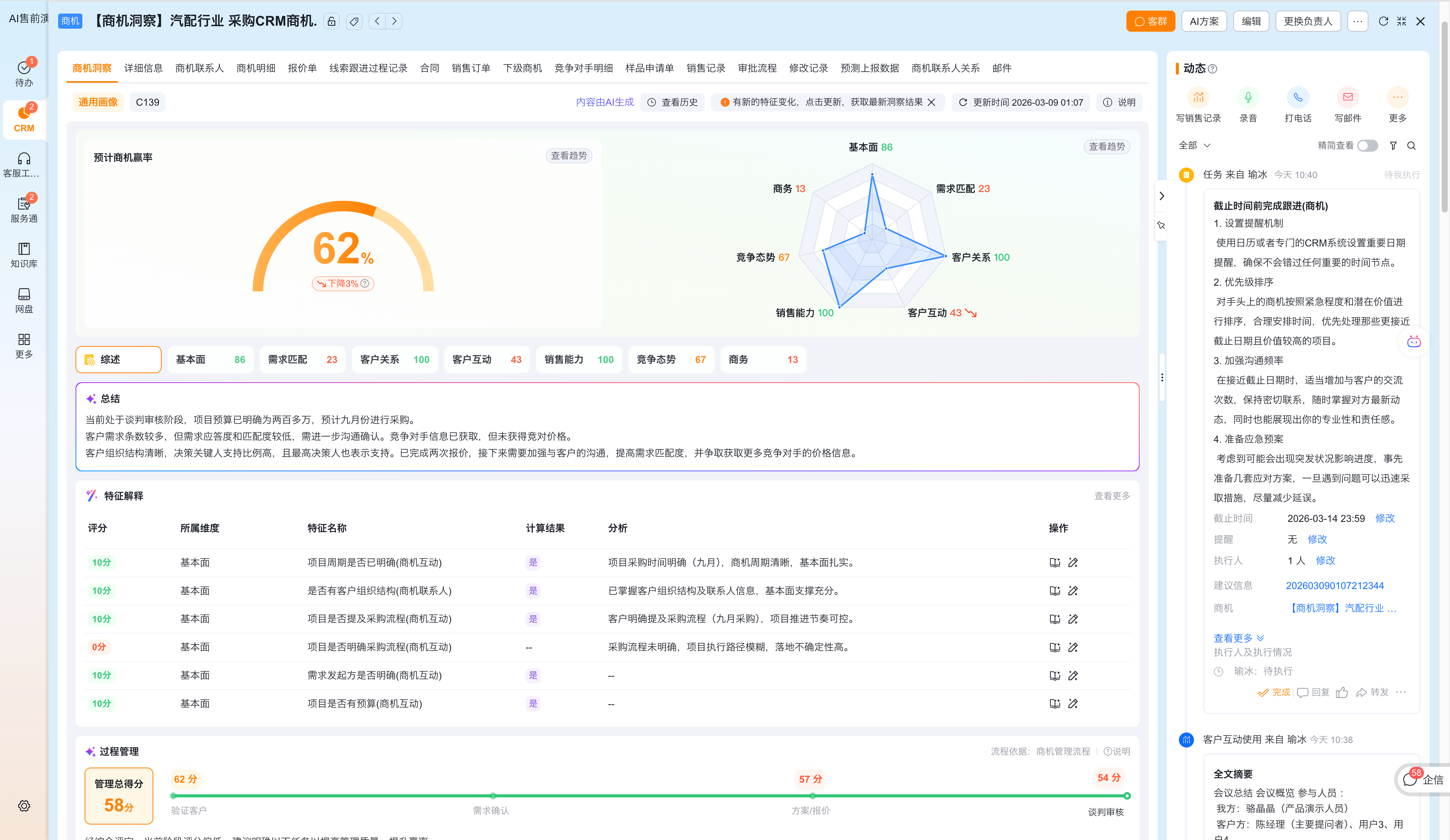 业务洞察运用AI技术,基于销售方法论、客观量化的监控销售动作。帮助销售组织从以下3个层面全面扩大线索、客户和商机的转化率,助力企业提升销售业绩。