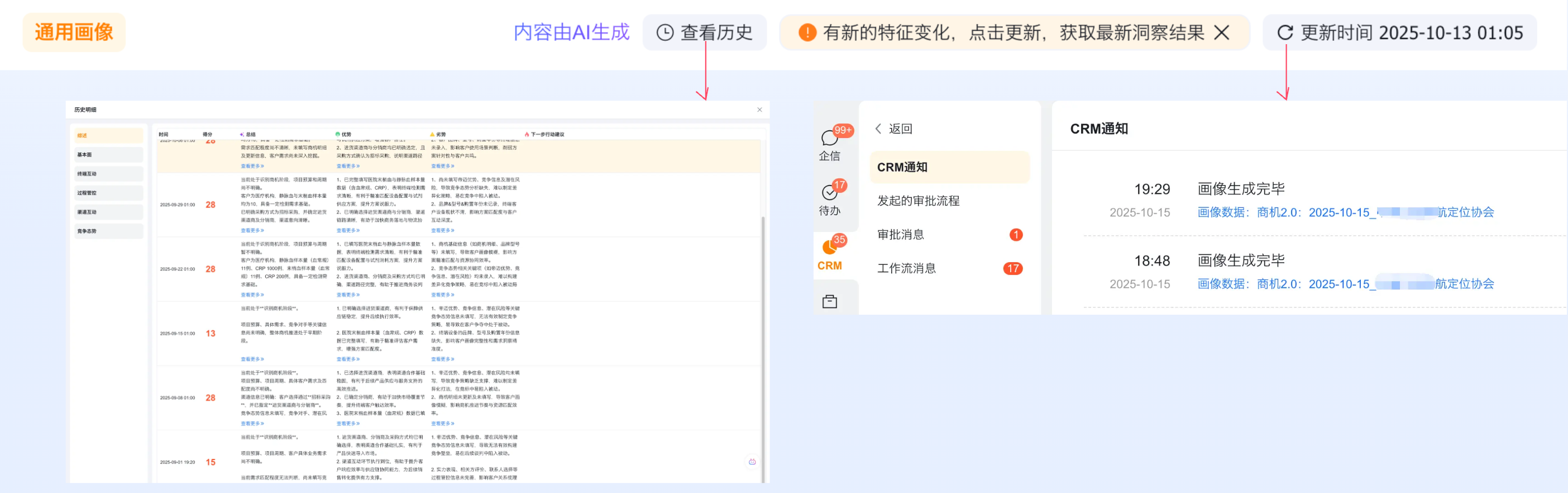 2.3更新&更新时间:手动点击更新按钮即可更新画像最新结果。 画像每次更新预计耗时5~10分钟,此期间会禁止重复点击更新按钮,当画像更新完成后会给操作人发送CRM提醒。