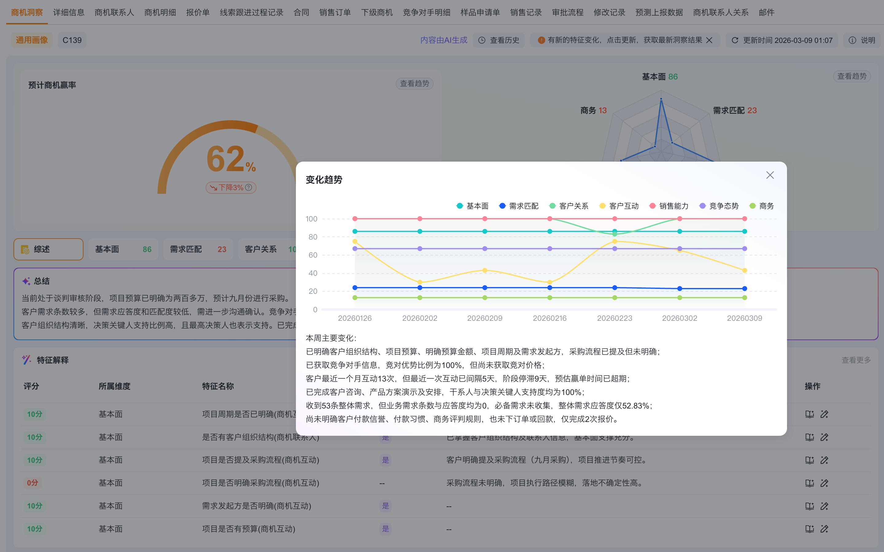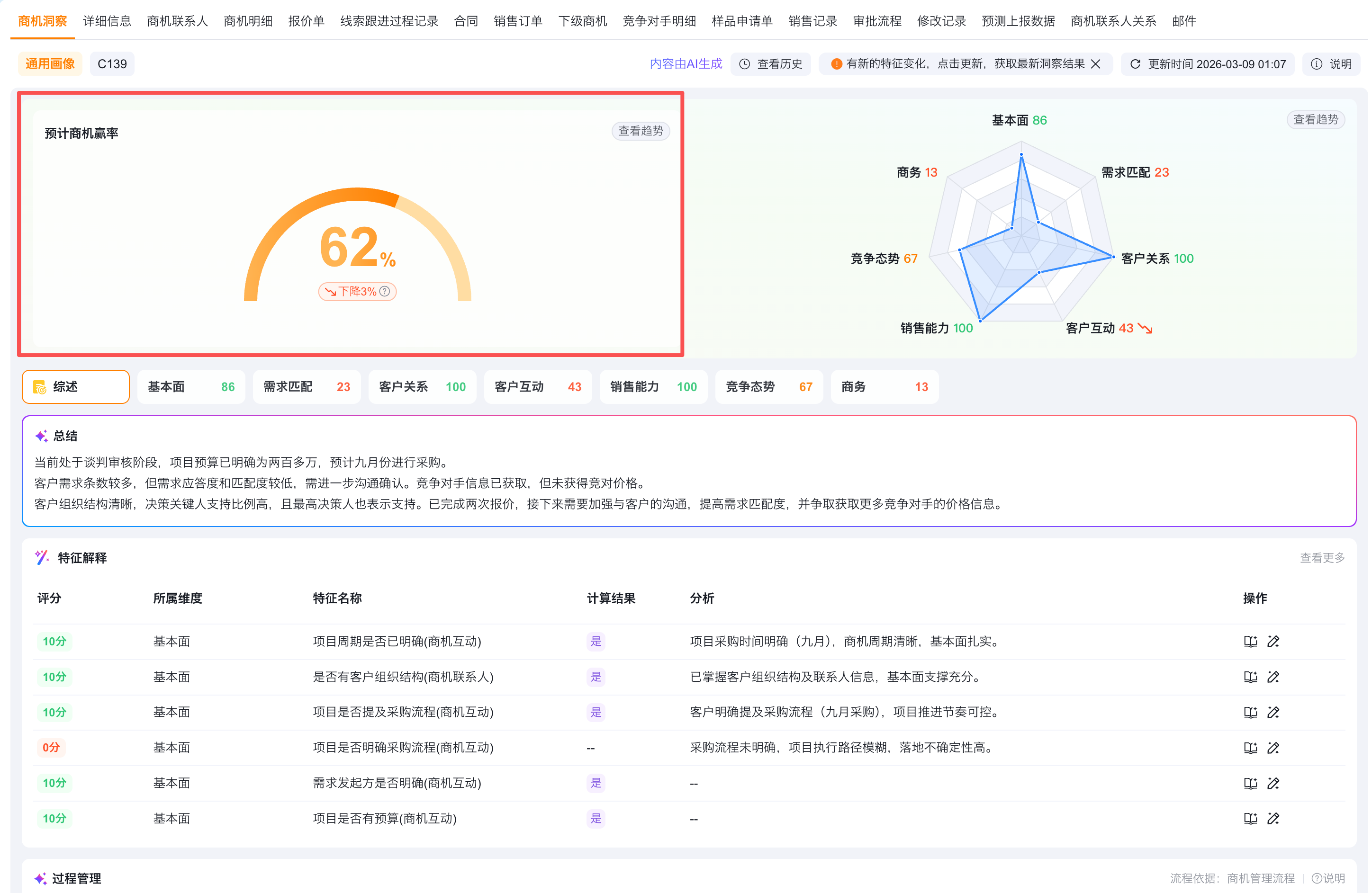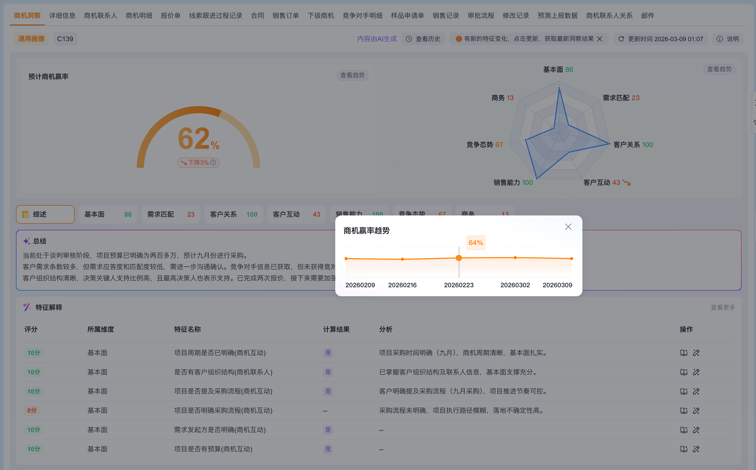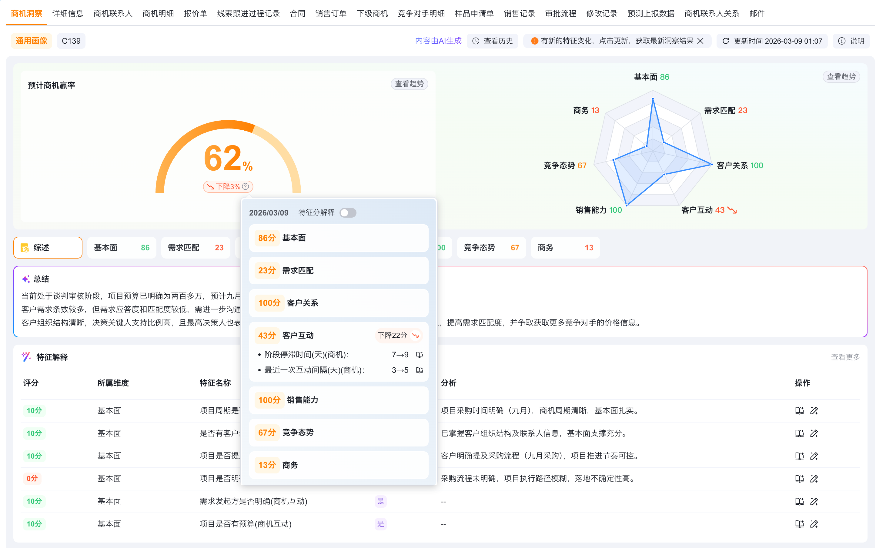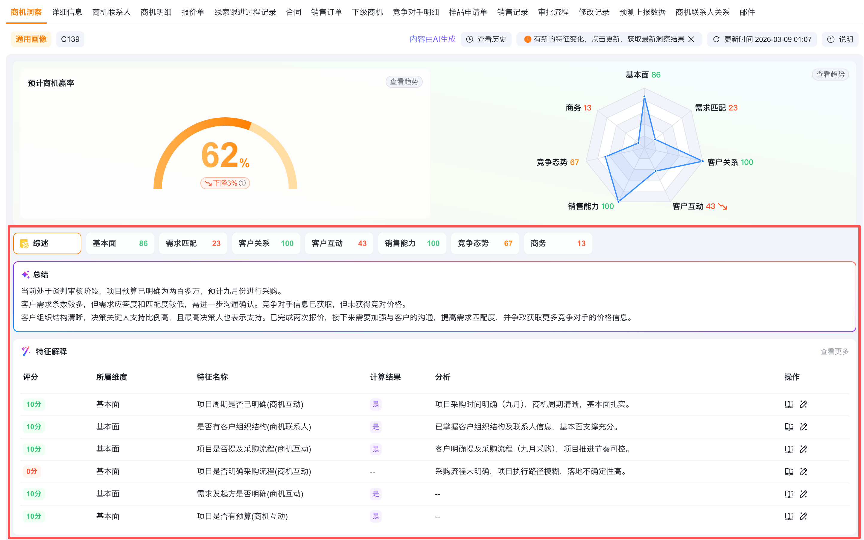 画像评分区会展示当前数据的洞察总得分,以商机为例,会展示为商机赢率(线索为线索评分,客户为客户健康度)。该得分由各个维度下的特征结果向上汇总计算而来,表现商机赢单概率的高低。