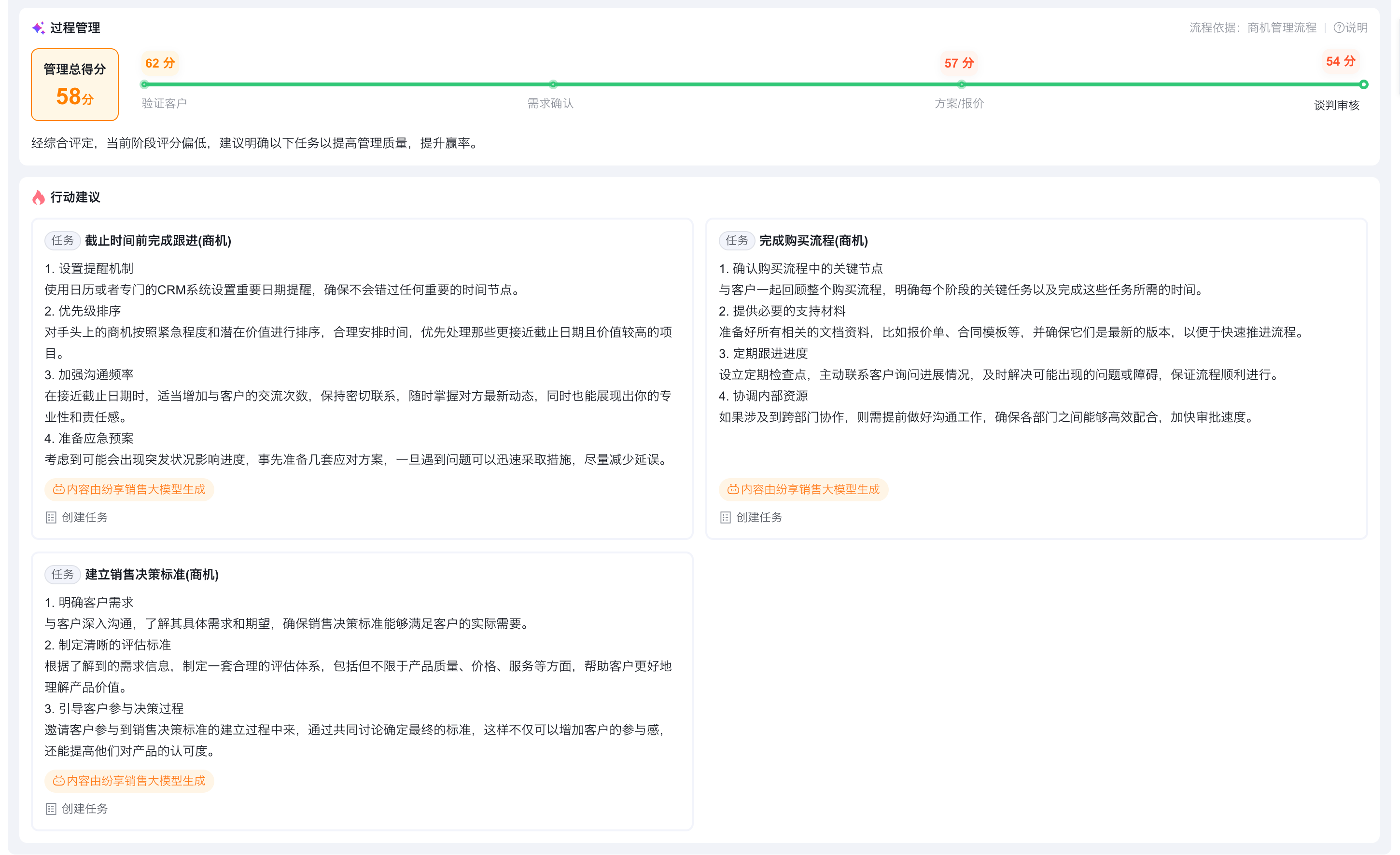 过程得分:评价销售在跟进过程中,各阶段的工作质量。得分基于阶段下完成任务的结果计算(例如:确认商机阶段任务为明确商机预算,销售跟进中确定客户是有预算的,质量得分为5分,如果确定客户有预算,且预算金额也明确,则质量得分为10分。)