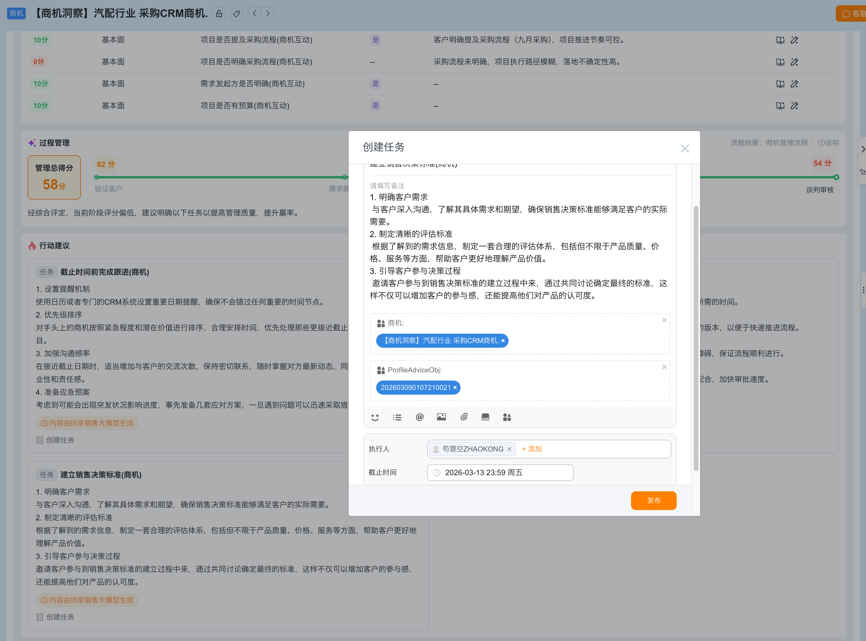 创建任务待办:基于系统给出的任务建议,使用者可以点击「创建任务」创建一个待办项,提醒自己/他人根据建议执行任务。