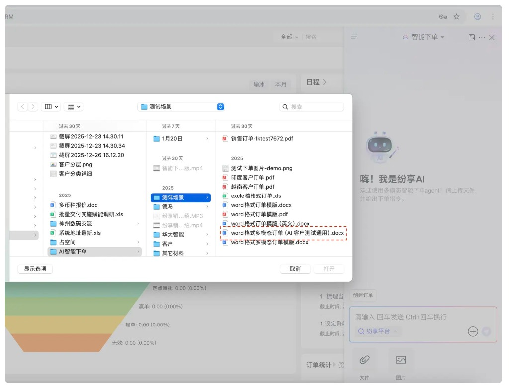 选择【智能下单】AI助理,上传需要识别的文件,给出“包含下单的指令”,或者文本录入下单详细信息,体验智能下单功能!