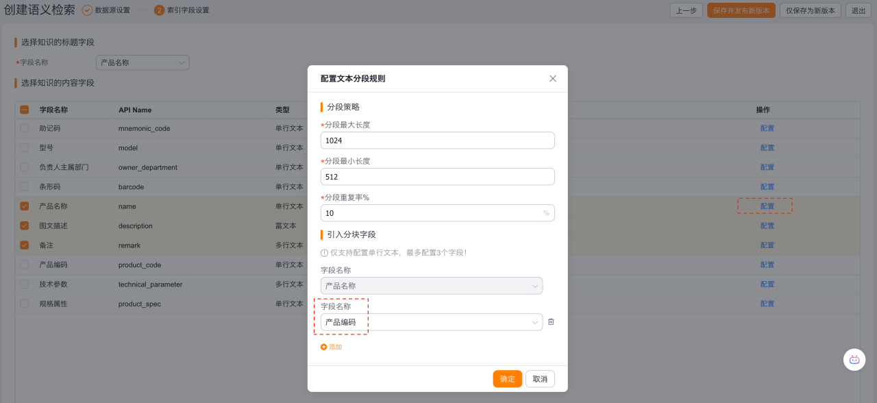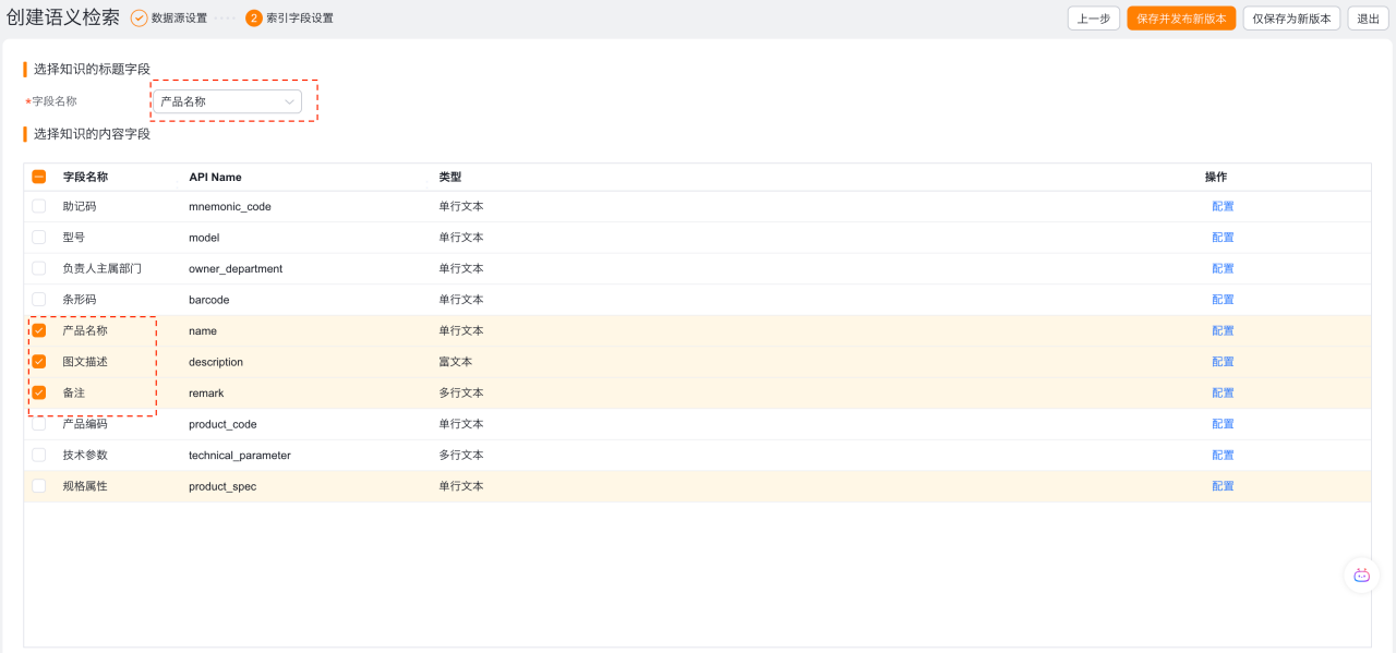 下一步:设置产品知识检索的标题字段及内容字段