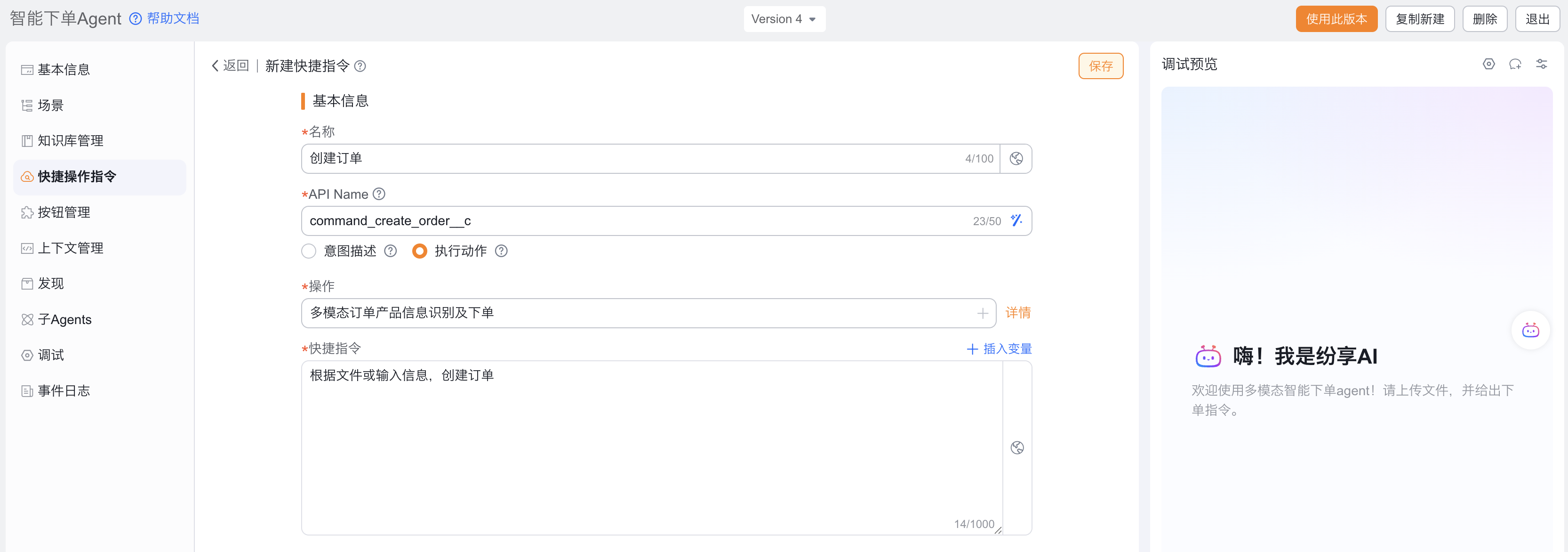 填写名称,可自定义;选择【执行动作】,选择:多模态订单产品信息识别及下单,添加指令描述,依次点击【保存】和【使用此版本】,完成快捷指令。