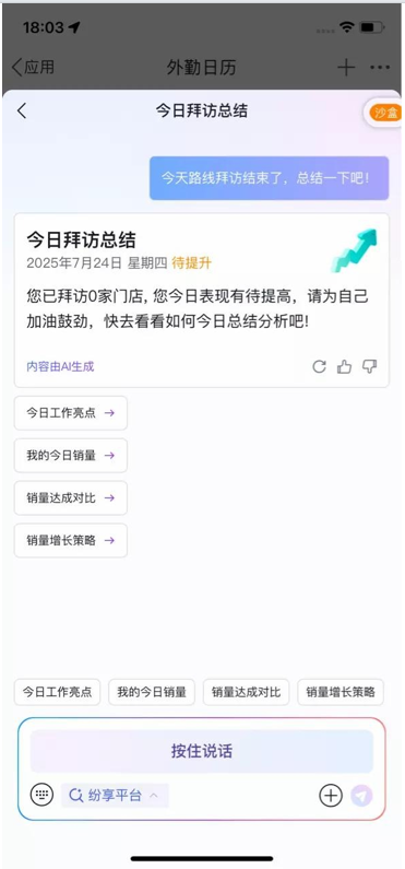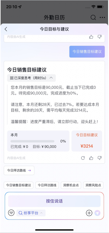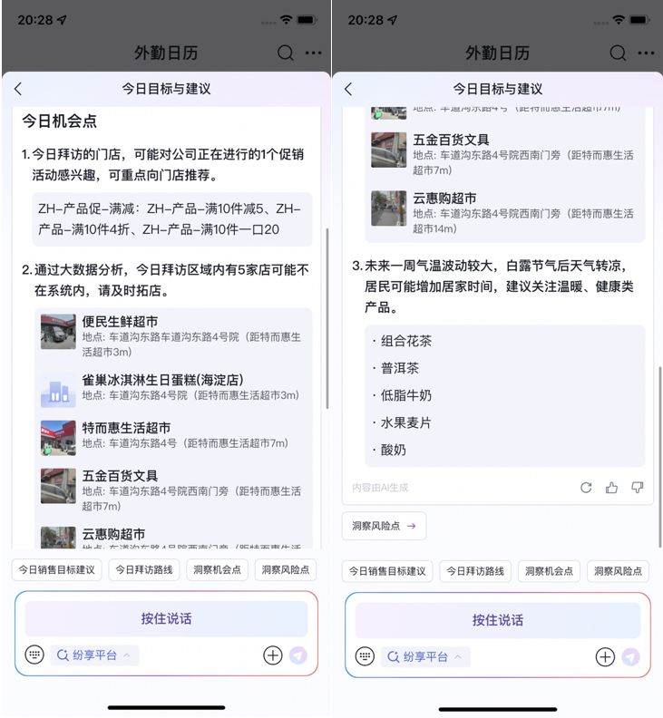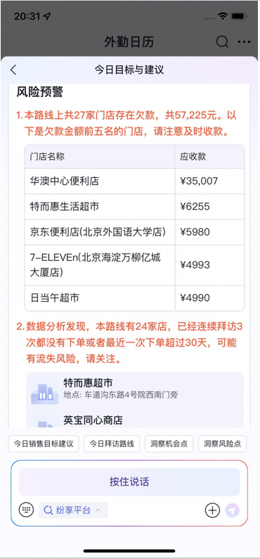 业代一天拜访的开始。访线前AI助手具备拆解目标、洞察路线机会,风险预警能力.