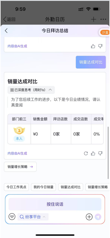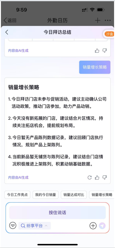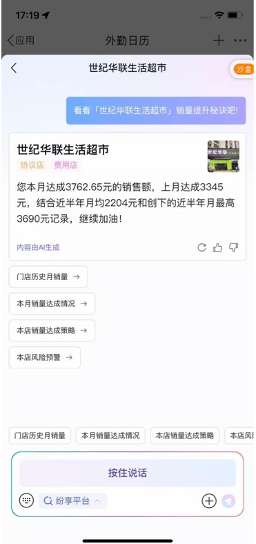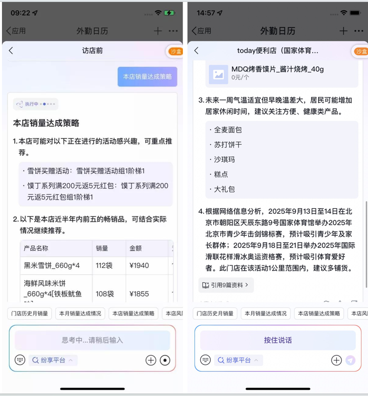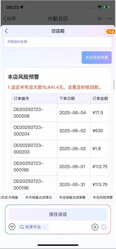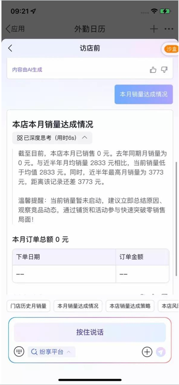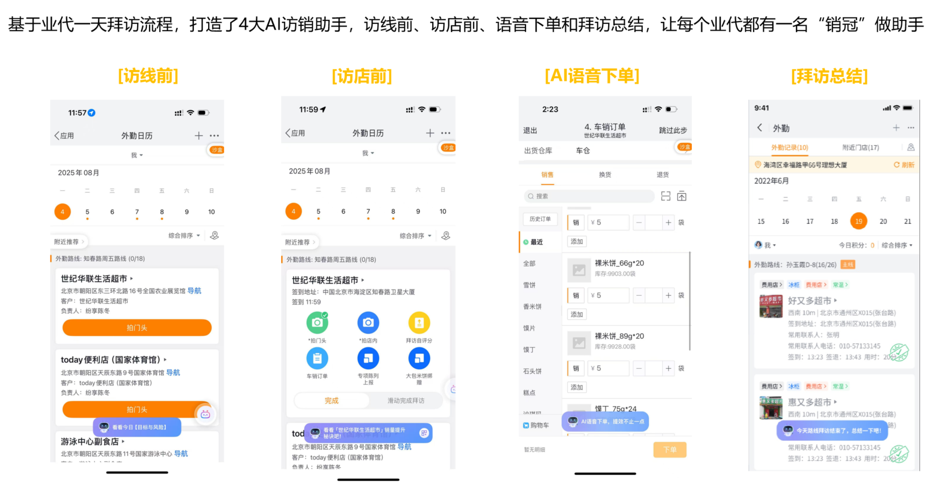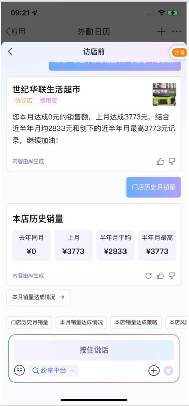 业代开始拜访门店。访店前AI助手具备本店历史销量分析、本店动销分析、洞察销量达成策略的能力.