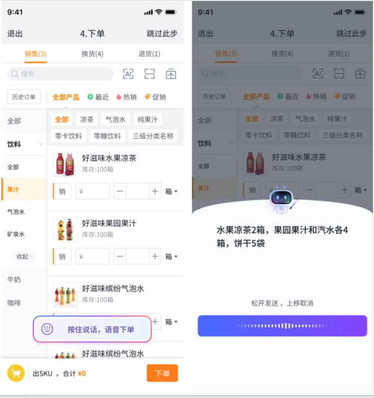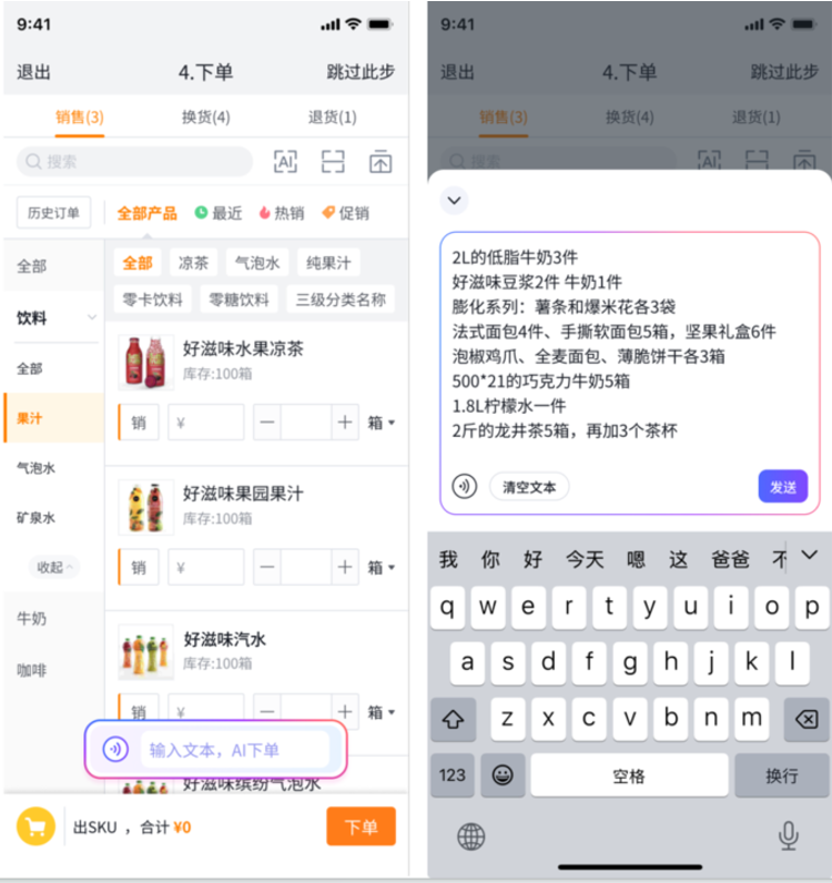 通过"AI语音/文本下单"功能,销售人员只要动动嘴说出产品简称、俗称,或一键复制粘贴订单文本,AI就能根据销售人员说话/文本的内容,理解意图、匹配产品,平均下单5个产品,只要3秒左右,就能准确呈现,极大节约了手动添加产品的耗时、省去繁琐步骤,提高下单准确率和效率。