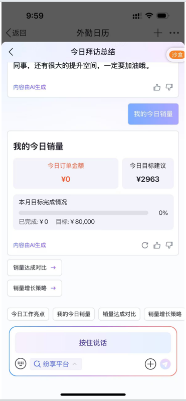 基于系统目标,AI结合时间进度和销售进度,给出今日需达成的目标建议,并结合企业知识库,给出下一步行动