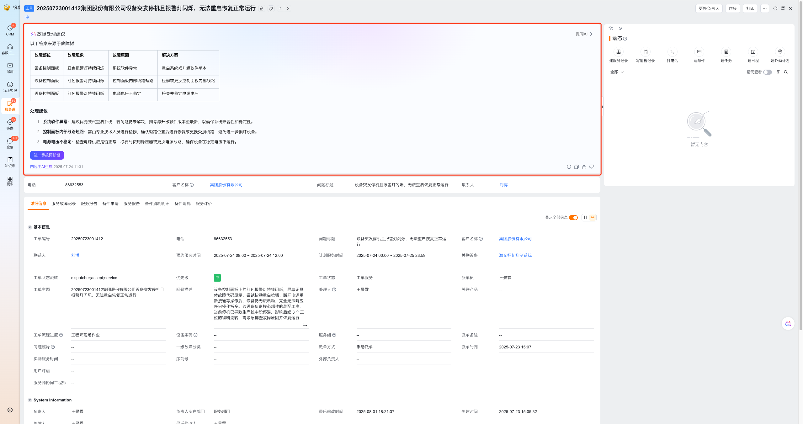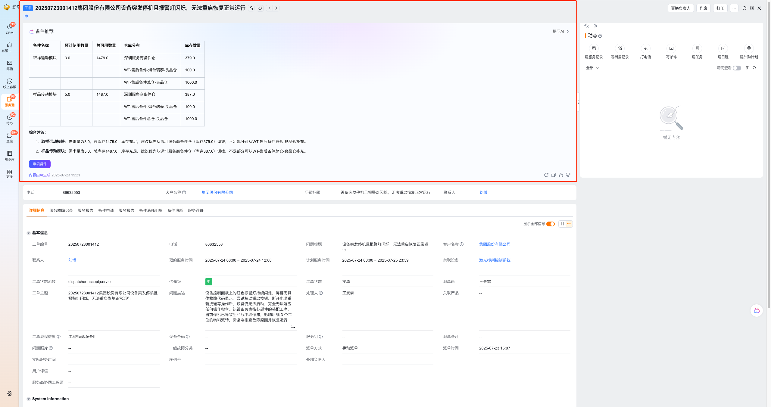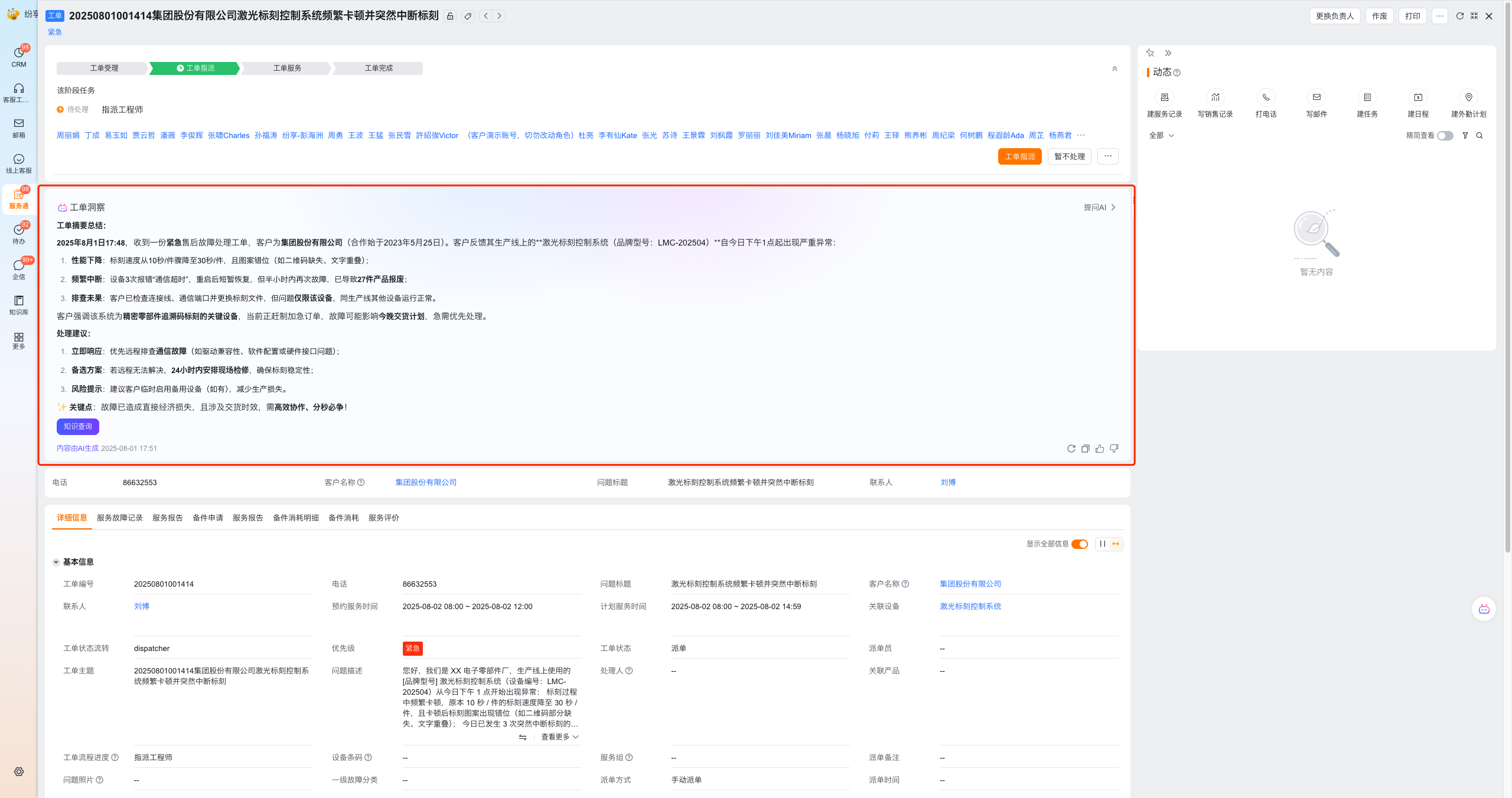 创建工单,需要洞察的工单字段尽量补充完整,以便AI获取足够的信息进行处理;将工单推进至【派单】阶段,效果如下所示: