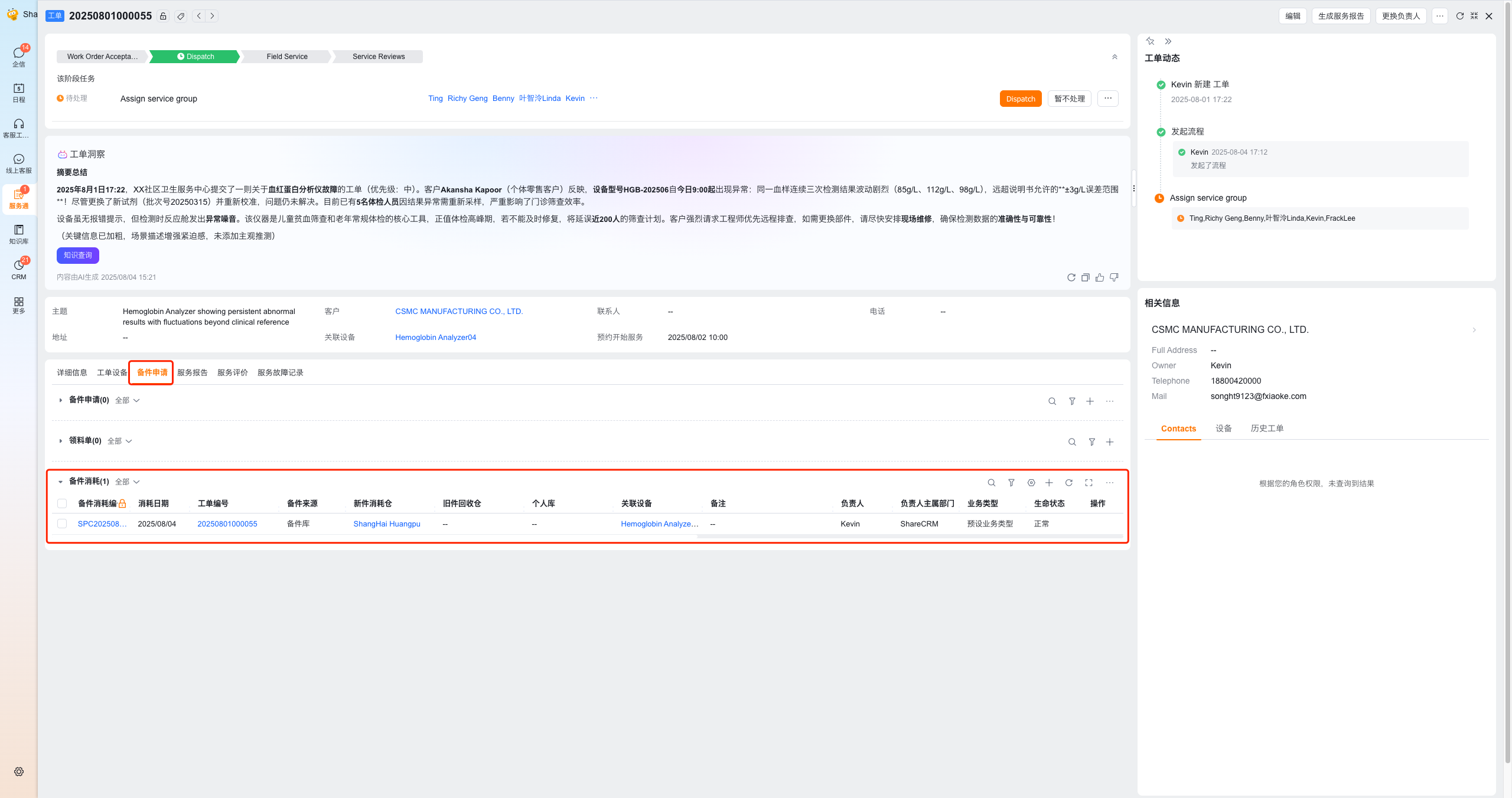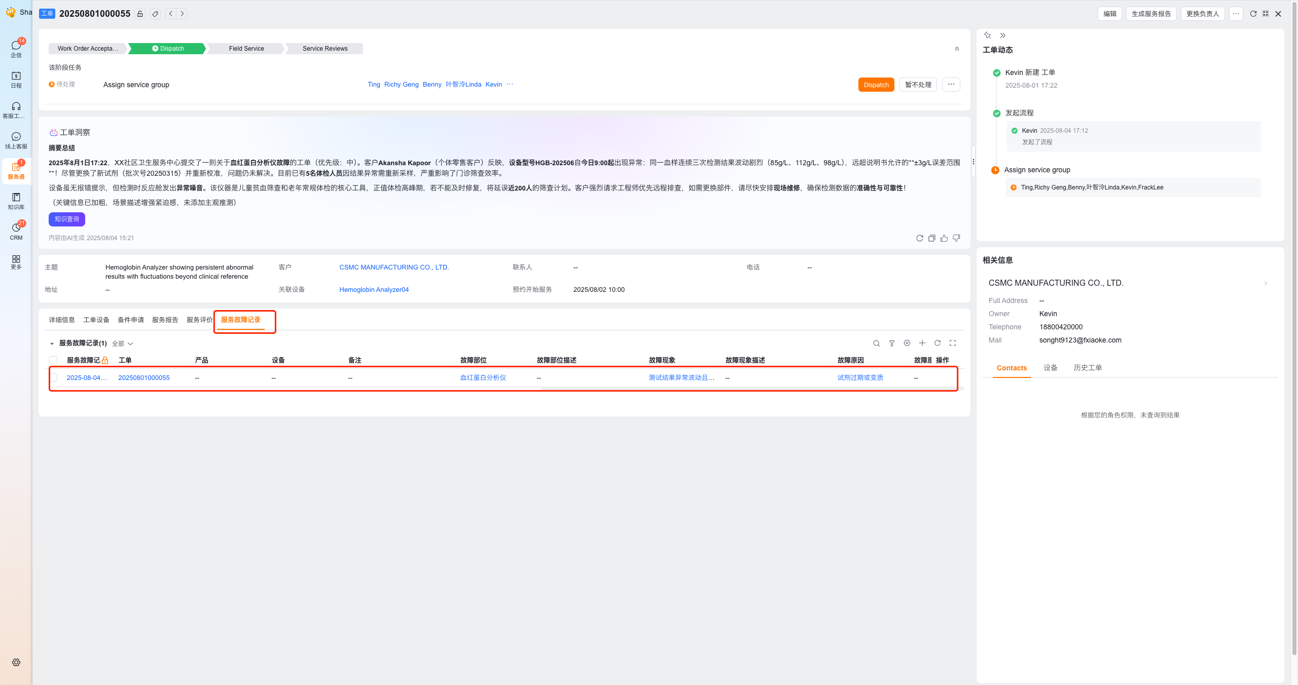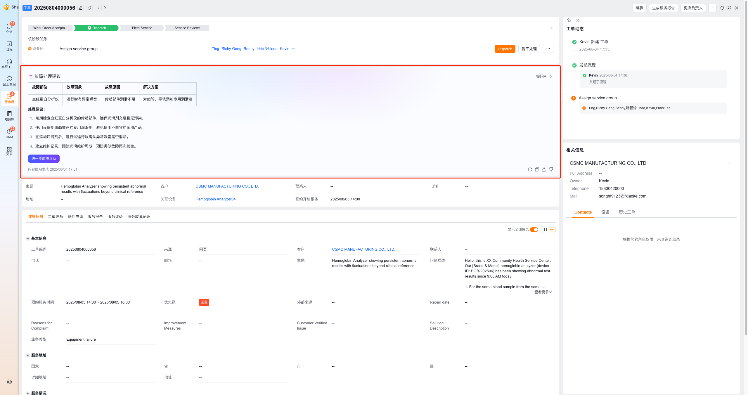 创建工单,需要洞察的工单字段尽量补充完整,以便AI获取足够的信息进行处理;将工单推进至【派单】阶段,效果如下所示: