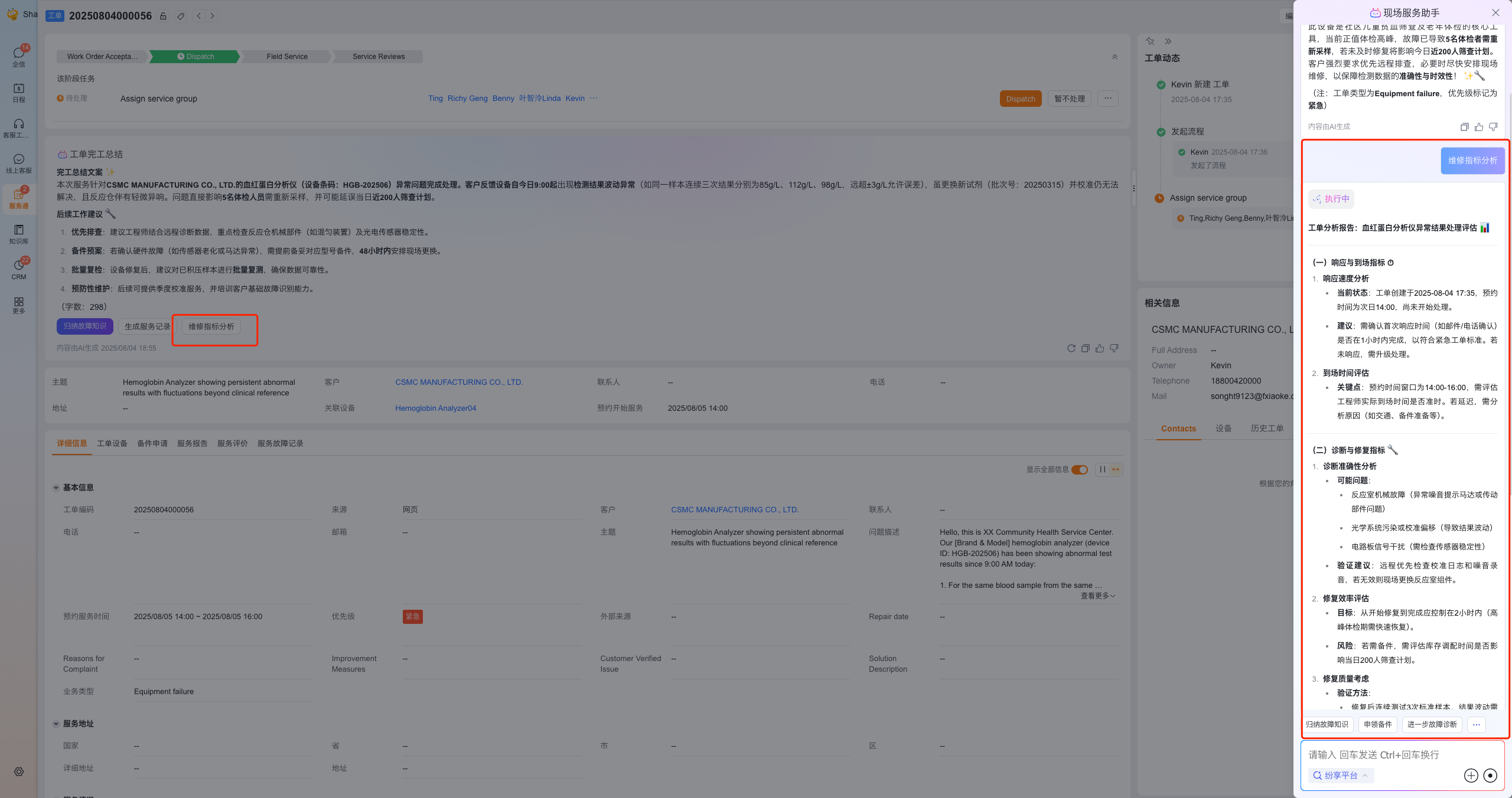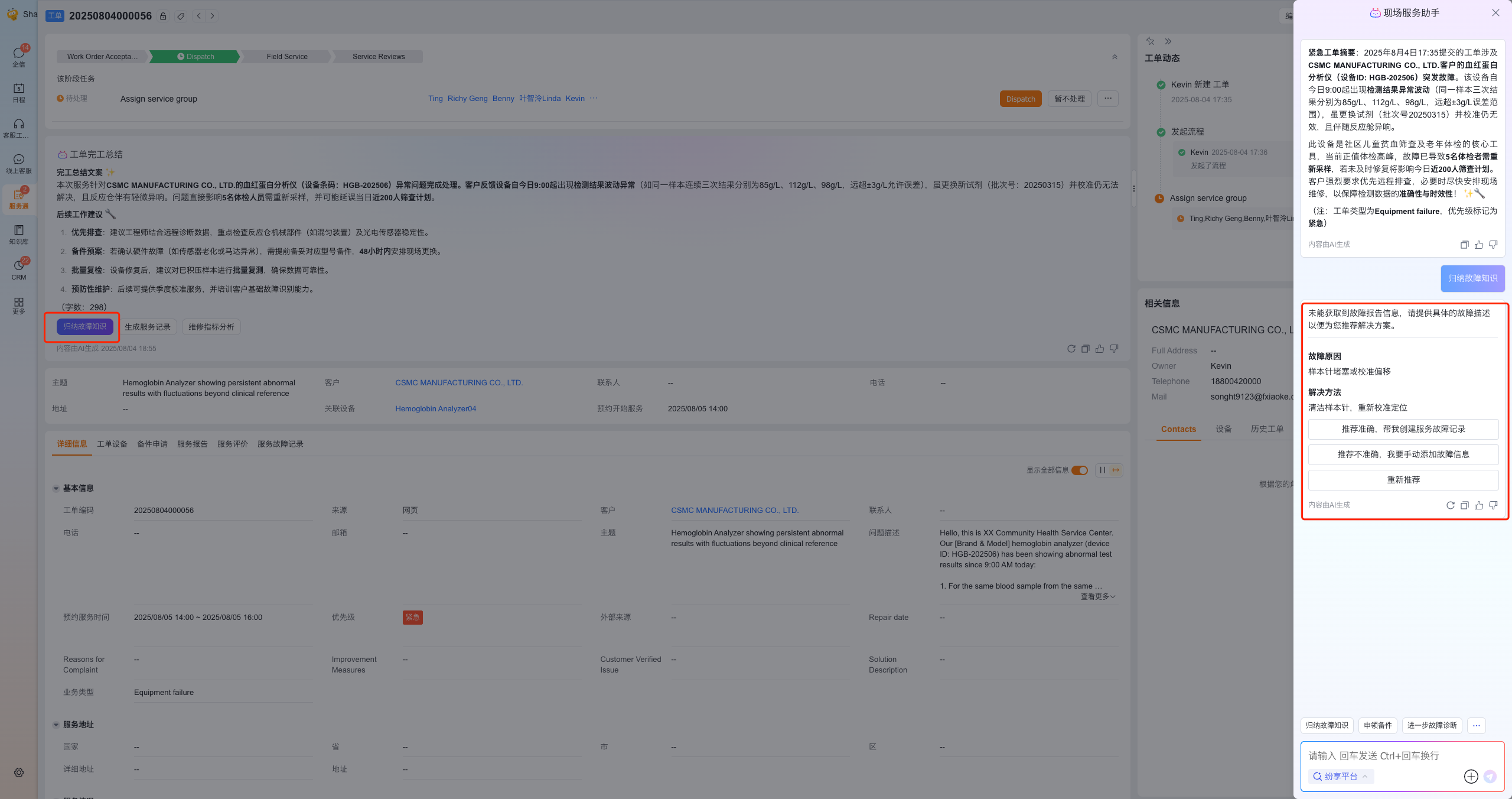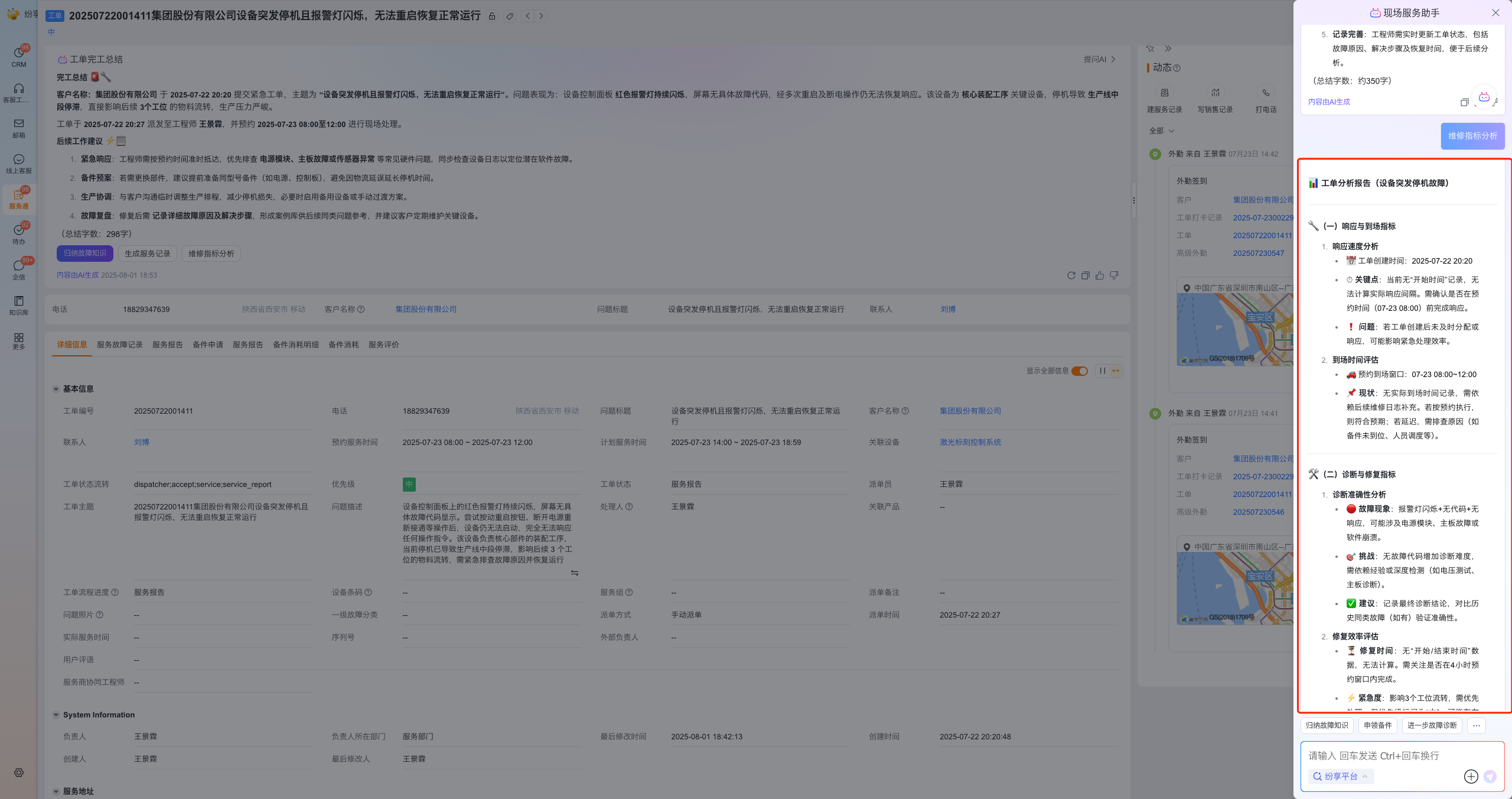 现场服务 Agent 能够对工单内容进行智能解析,通过 AI 总结工单要点,提炼关键信息,如故障现象、设备型号、客户基本情况等,帮助工程师快速了解任务概貌。