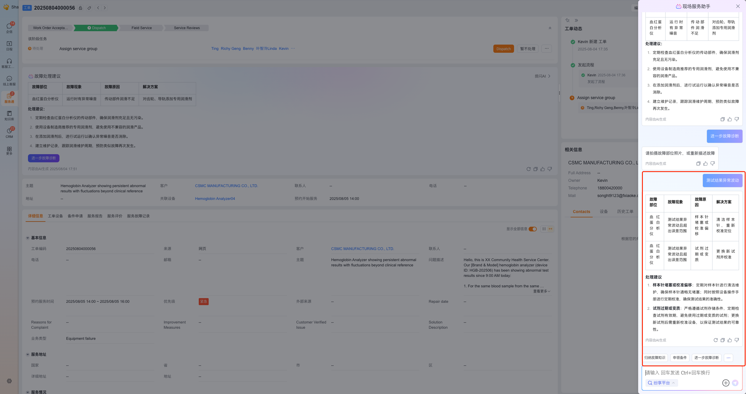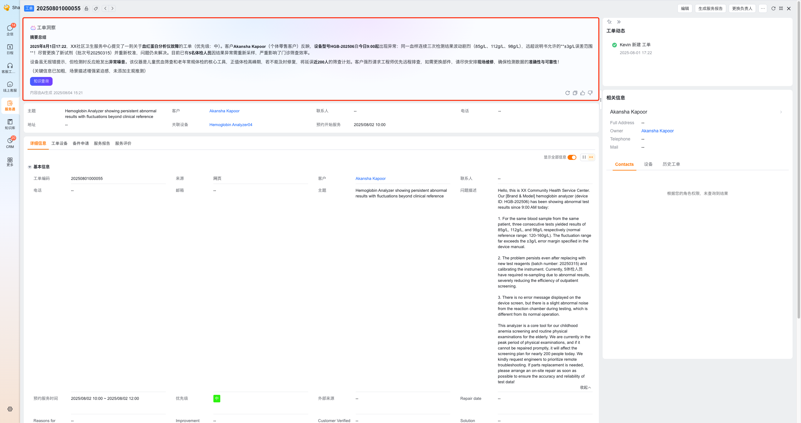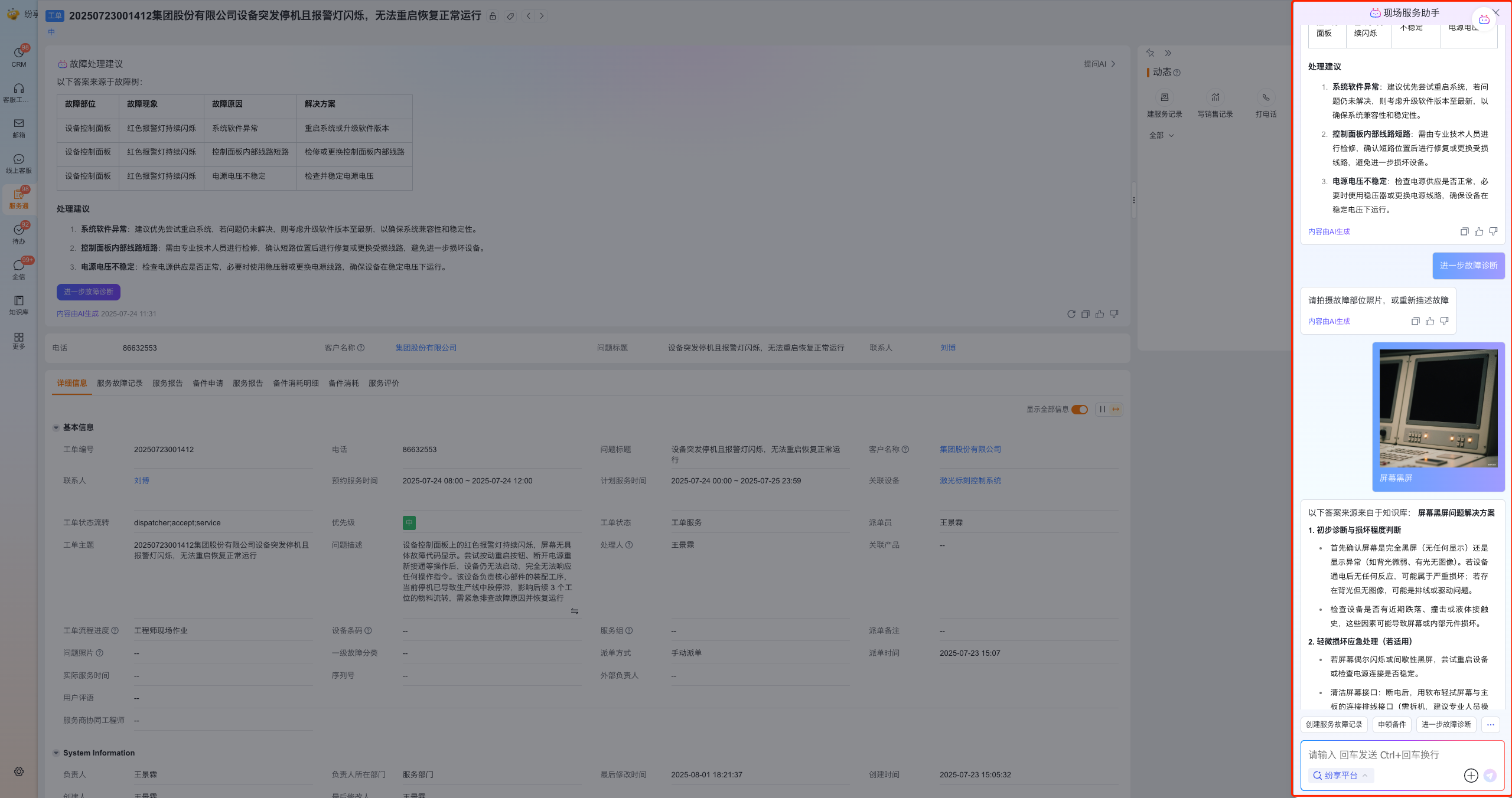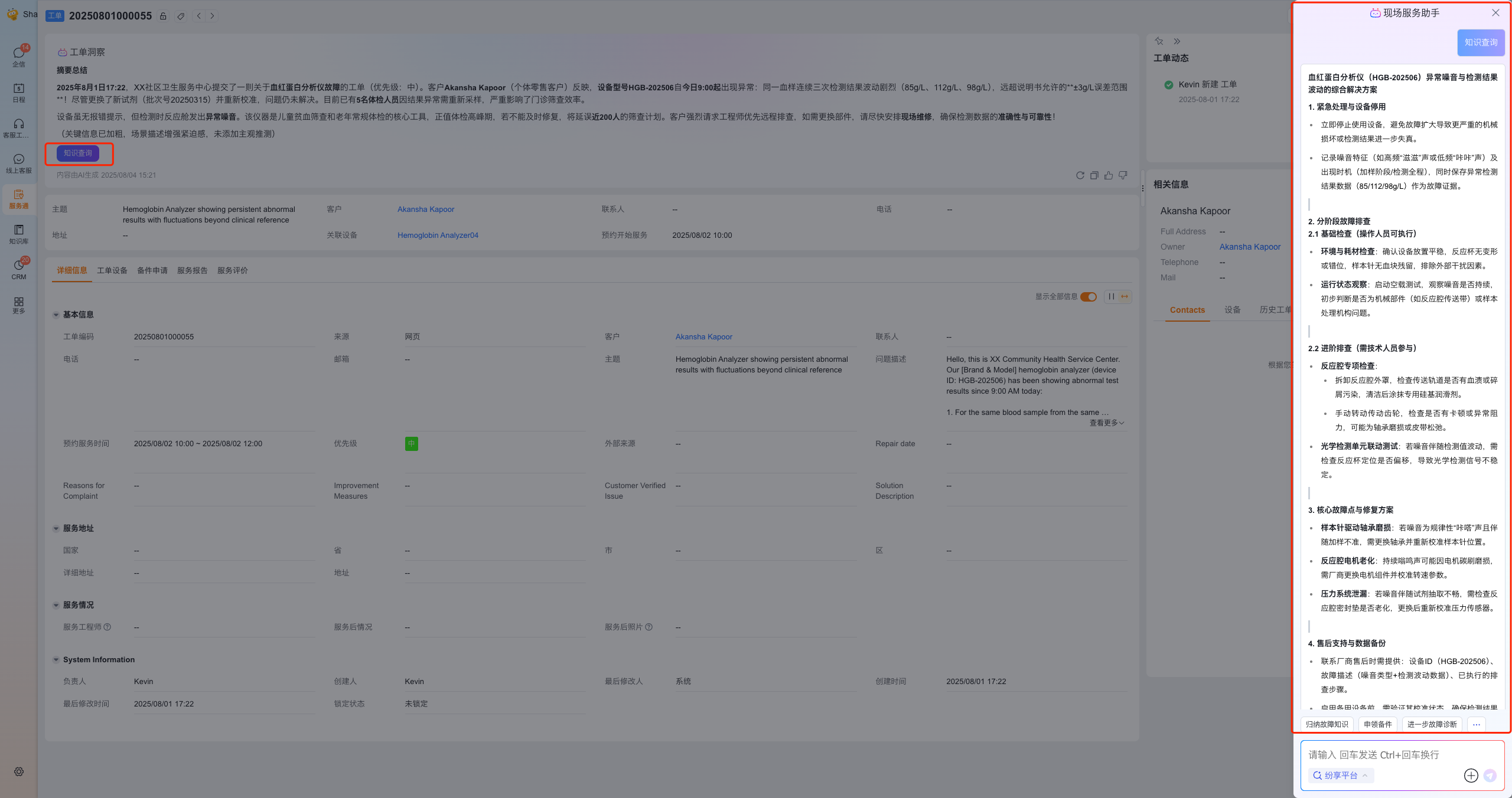 现场服务 Agent 能够对工单内容进行智能解析,通过 AI 总结工单要点,提炼关键信息,如故障现象、设备型号、客户基本情况等,帮助工程师快速了解任务概貌。