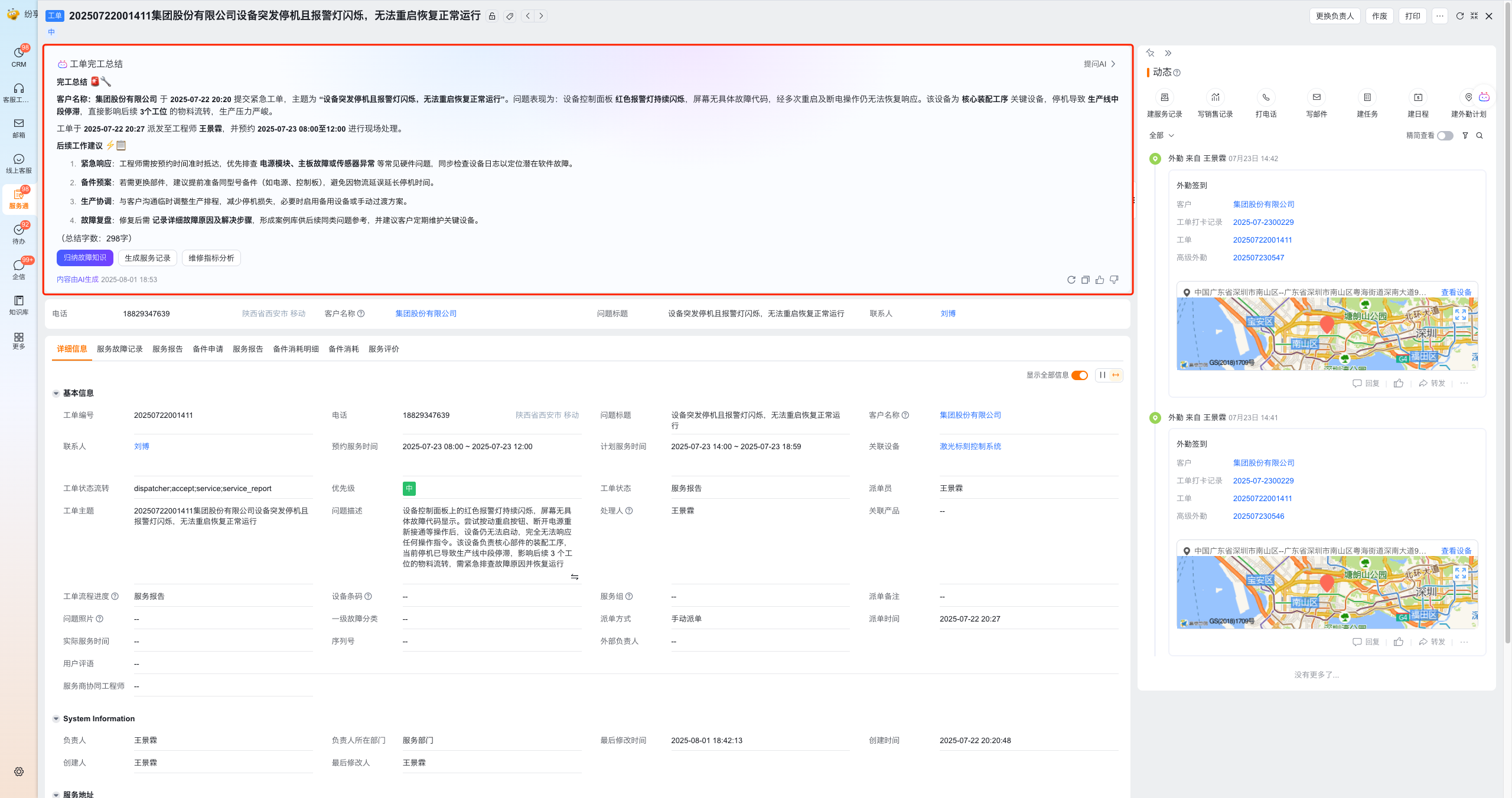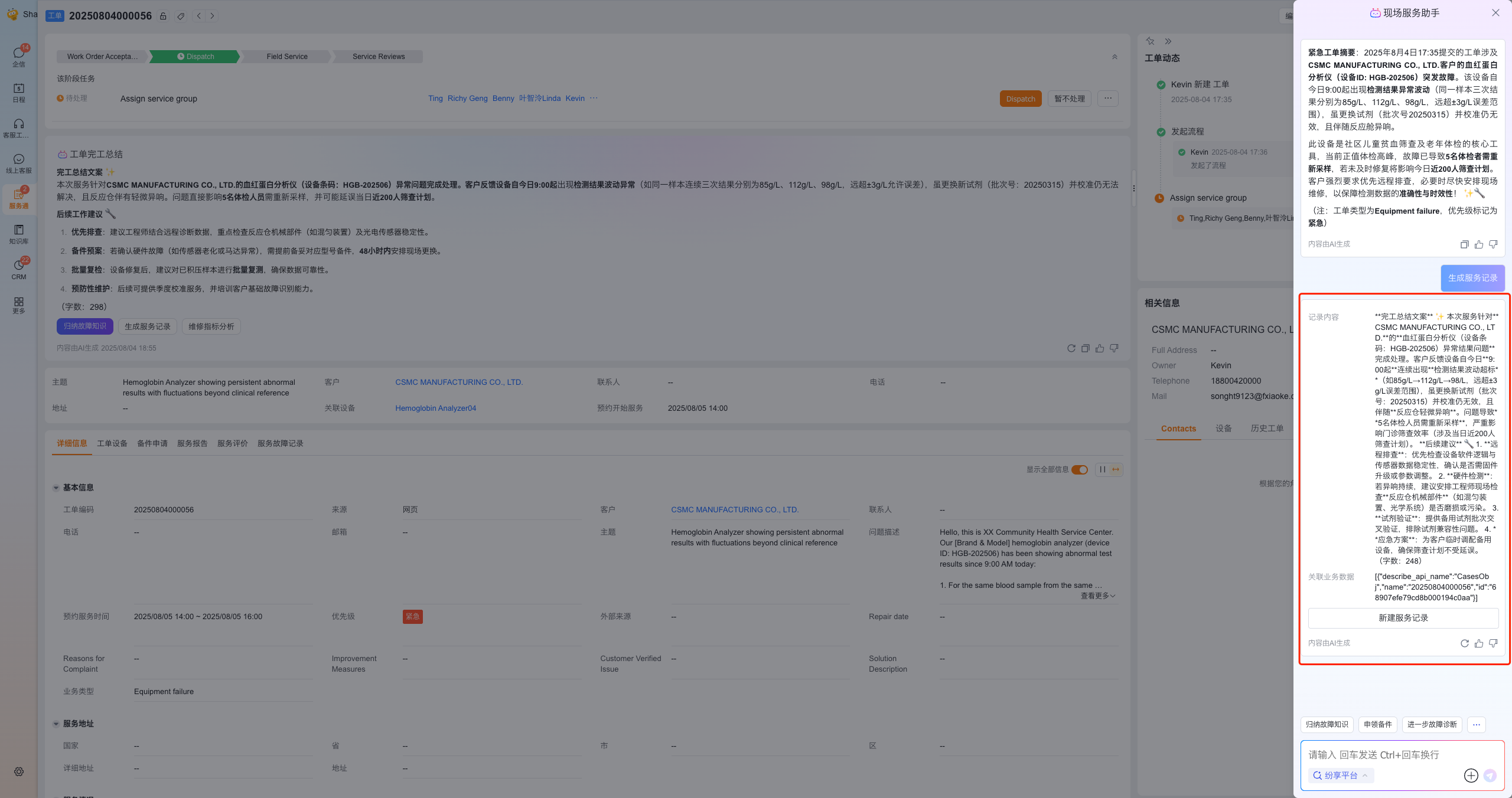 工程师完成服务后,AI 基于服务过程中记录的关键数据,自动生成完工总结