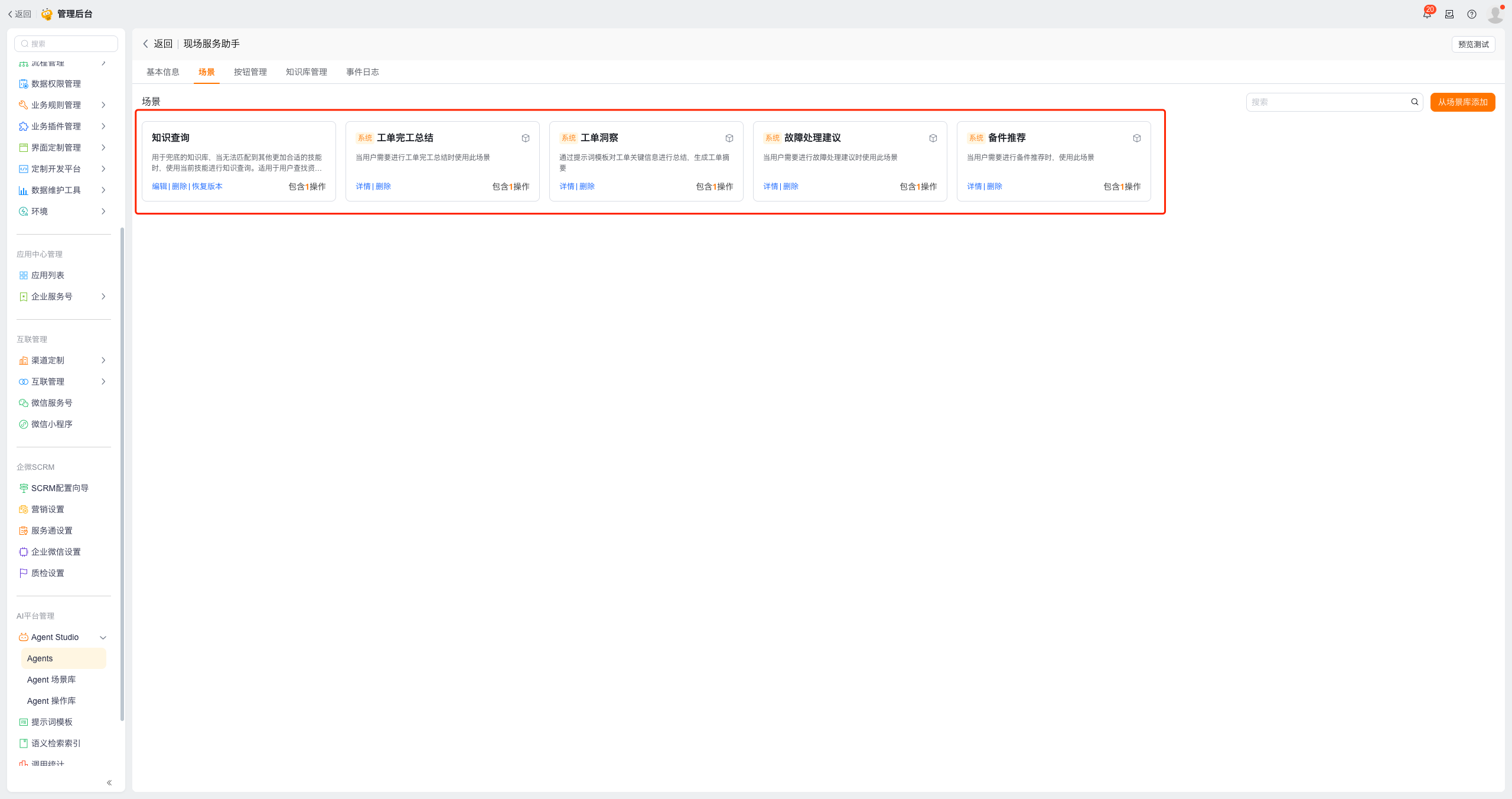 默认Agent对话内容:既定义洞察组件触发时,会调用Agents什么能力,如在现场服务助手中预设了五个场景,在此处决定了洞察组件会命中Agents哪个场景