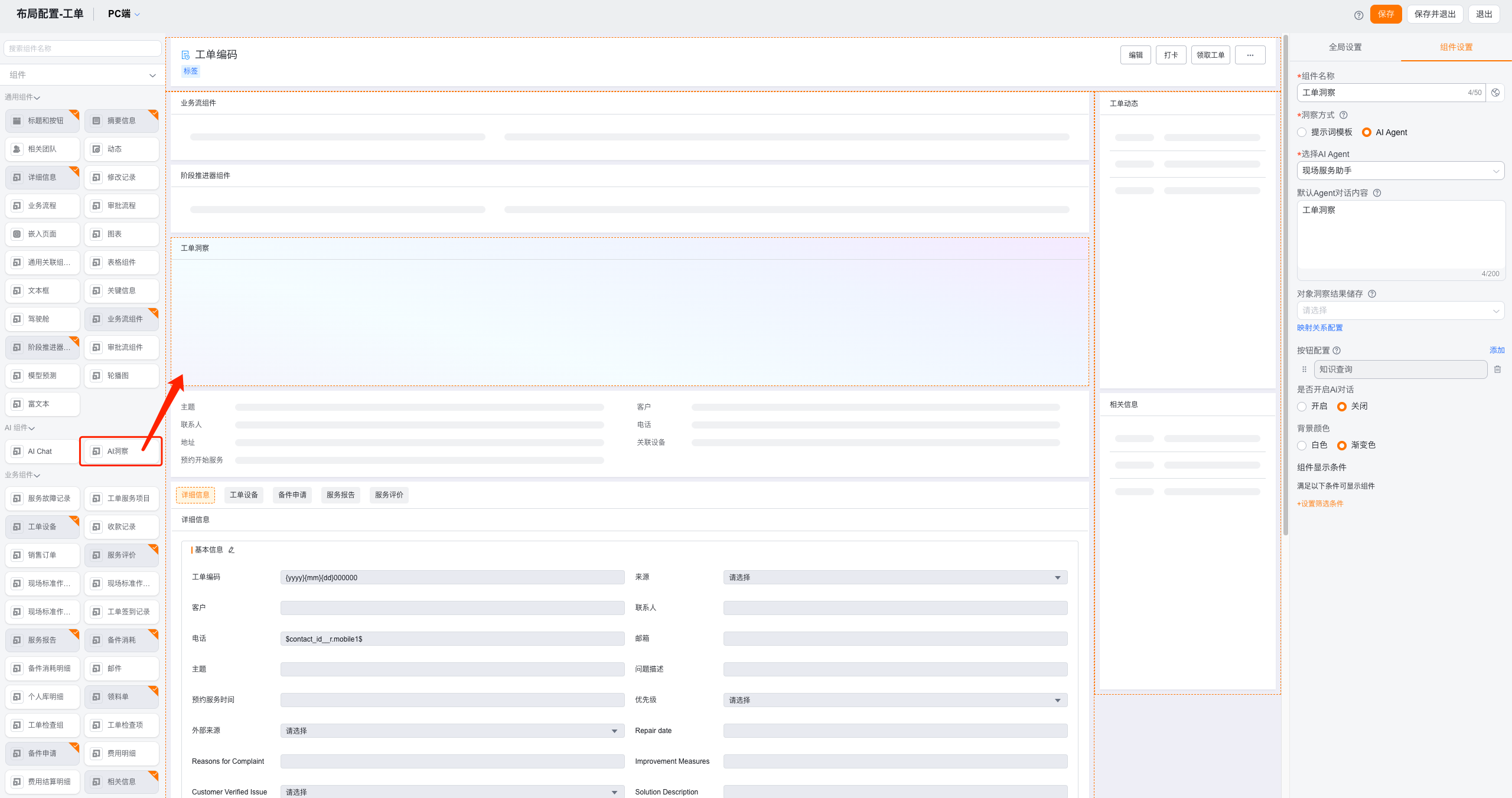 纷享销客提供了平台级通用AI洞察 组件,支持对象详情页布局设计器根据业务需求灵活配置。