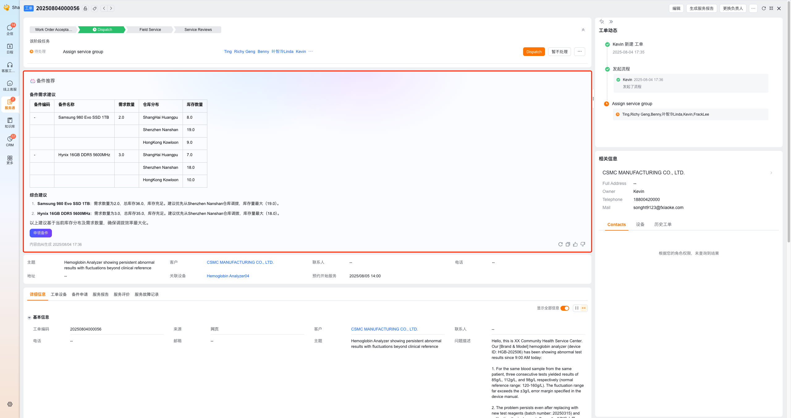 在工程师已接单但尚未上门服务时,现场服务Agent基于工单中的设备型号、故障类型,结合企业备件数据库与历史维修数据,精准推荐所需备件并查询相关库存