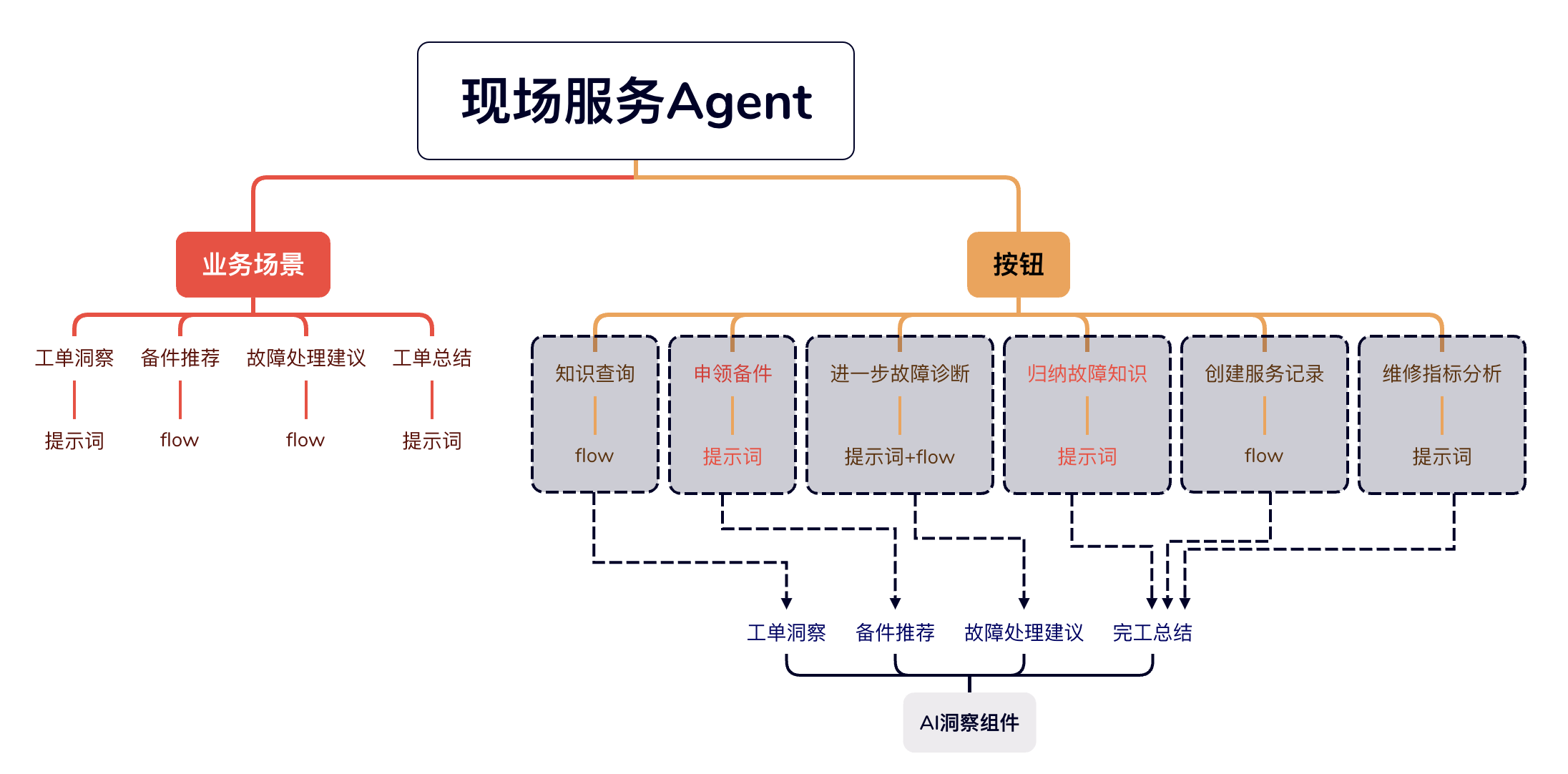 | 工单洞察 | 工单状态cases_state=“dispatcher”时显示 | 现场服务Agent | 工单洞察 | 知识查询 |