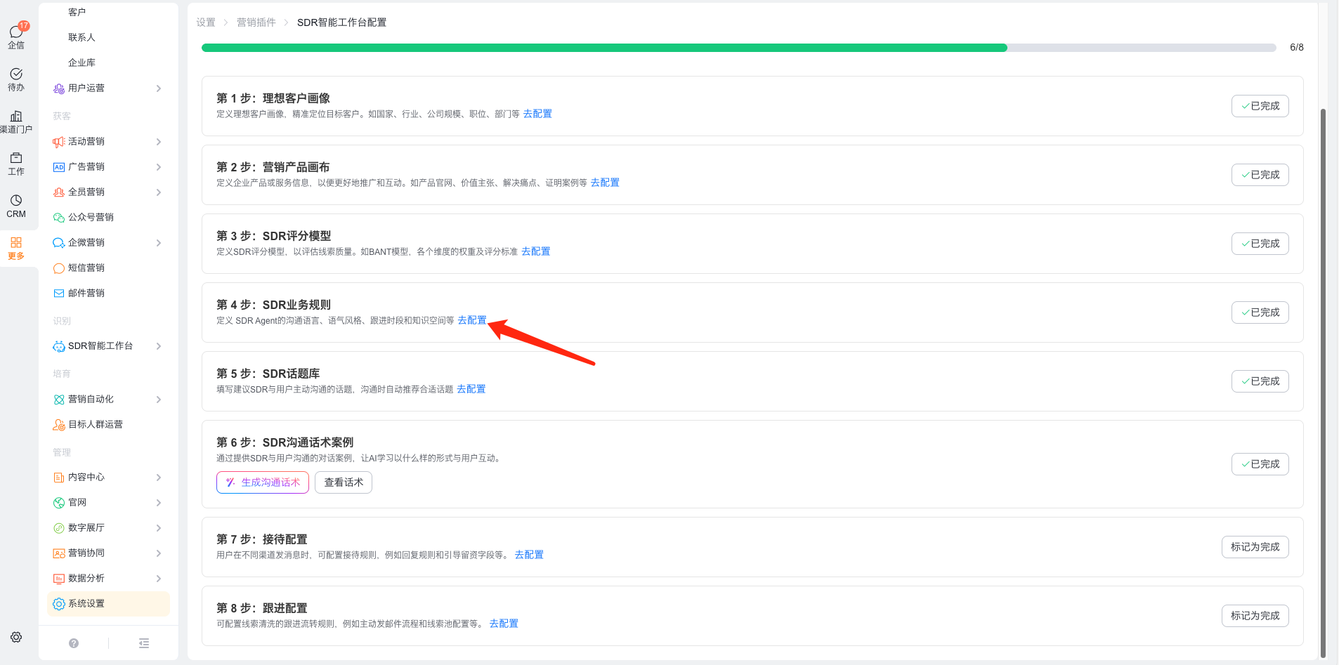 1、前往营销通>系统设置>营销插件>SDR智能工作台进行设置,详见:https://help.fxiaoke.com/93d5/c8de/6031/5550。其中核心配置跟进规则。