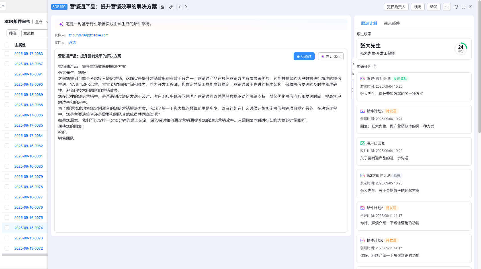 3、配置完成后,一旦线索进入配置的机器人跟进线索池,机器人将自动按照规则给线索写邮件,若开启了审核,邮件将进入审核列表。