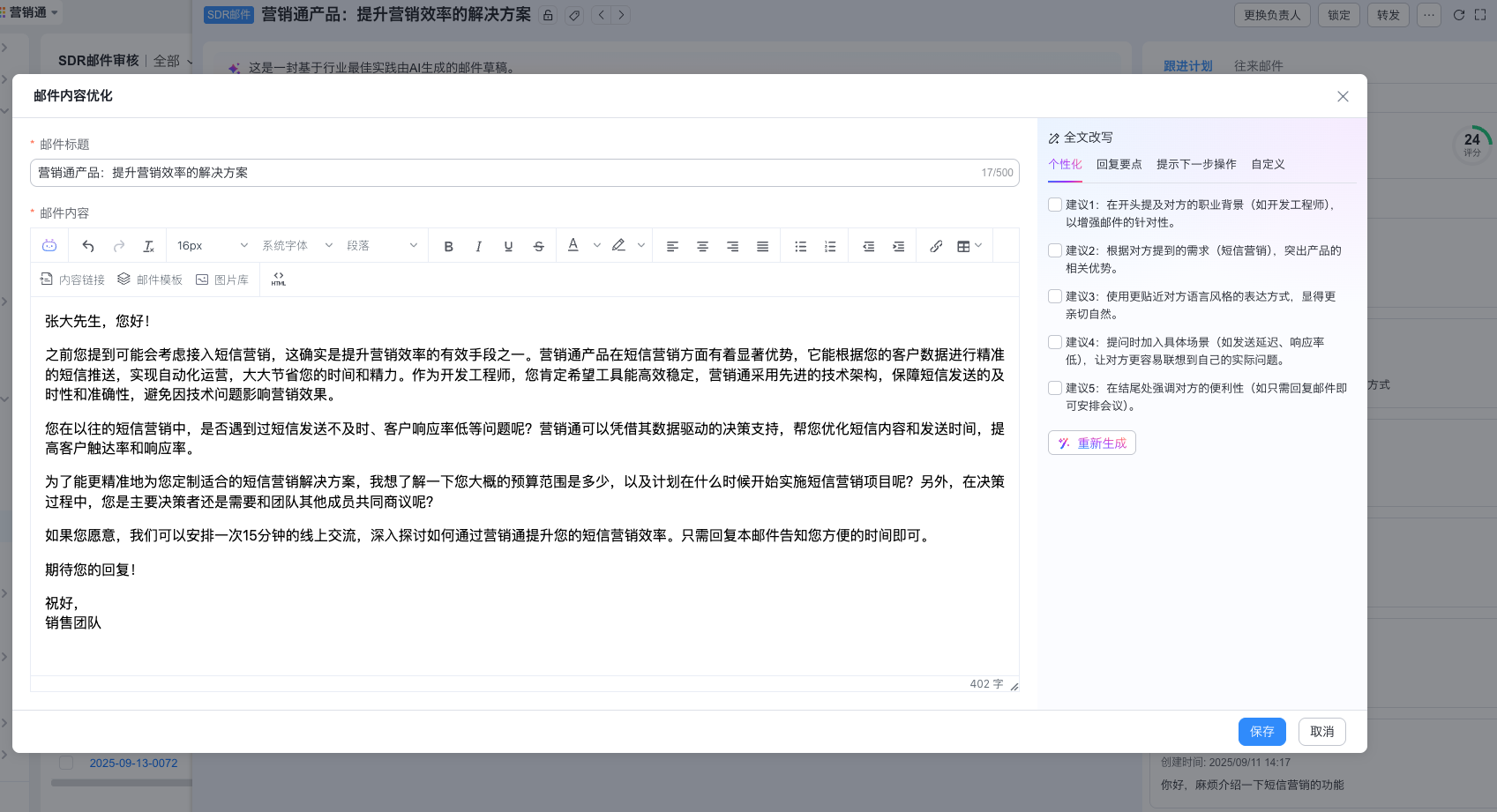 可以设置自动跟进规则(跟进时间节奏、回复风格和语言等),SDR Agent会自动写邮件(支持人工审核)发送给客户,进行沟通互动对线索进行培育清洗,直至完成CTA动作(例如预约销售会议)。